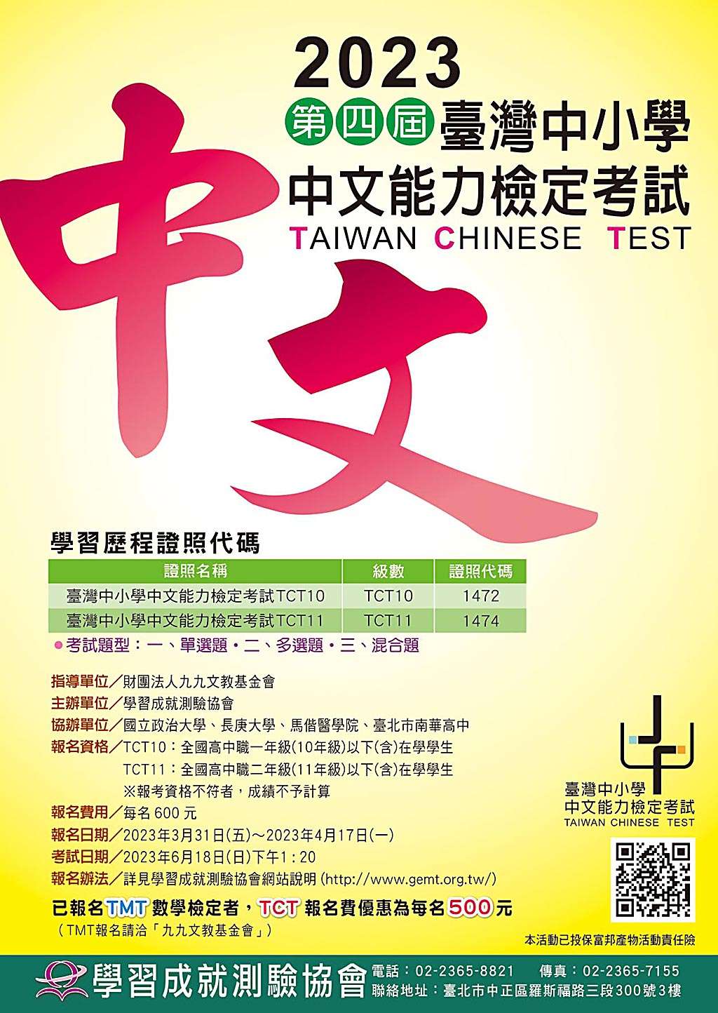 一、財團法人九九文教基金會為「臺灣中小學中文能力檢定考 試」指導單位,是以代為轉發本活動資訊。 二、檢定日期:2023年6月18日(星期日)下午13:20。 三、檢定項目與資格: 1、TCT10:10年級(高中一年級)以下(含)在學學生 2、TCT11:11年級(高中二年級)以下(含)在學學生 四、報名費用:每名學生新台幣600元,中(低)收入戶者繳交 證明則免報名費。 五、報名期間:2023年3月31日(星期五)至4月17日(星期 一)。 六、如需進一步訊息請逕洽「中華民國全國學生學習成就測驗 協會」承辦人。