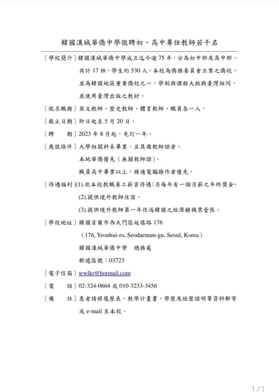 轉知漢城華僑中學徵聘教師及職員一案。