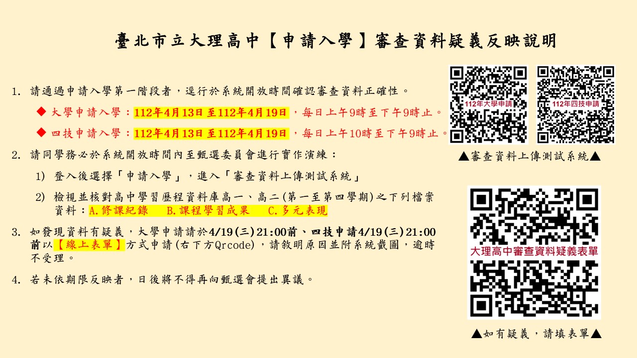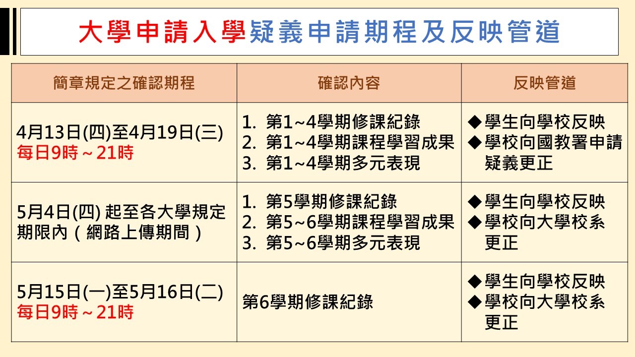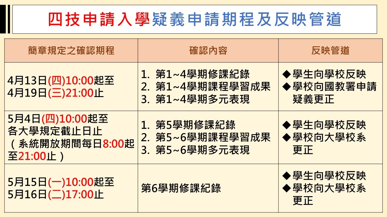 如發現資料有疑義,大學申請請於4/19(三)21:00前、四技申請4/19(三)21:00前以【線上表單】方式申請,請敘明原因並附系統截圖,逾時不受理。