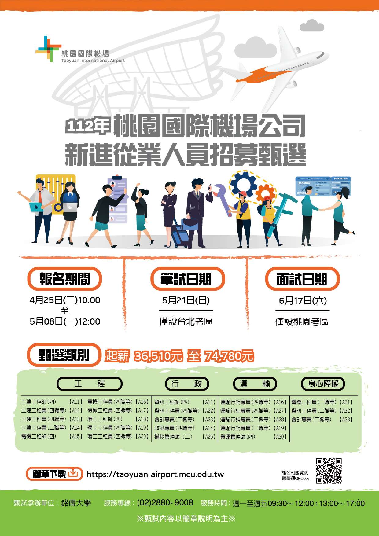 一、旨揭報名時間自112年4月25日(星期二)10:00至5月08日(星 期一)中午12:00止,簡章下載及報名網址: https://taoyuan-airport.mcu.edu.tw/。