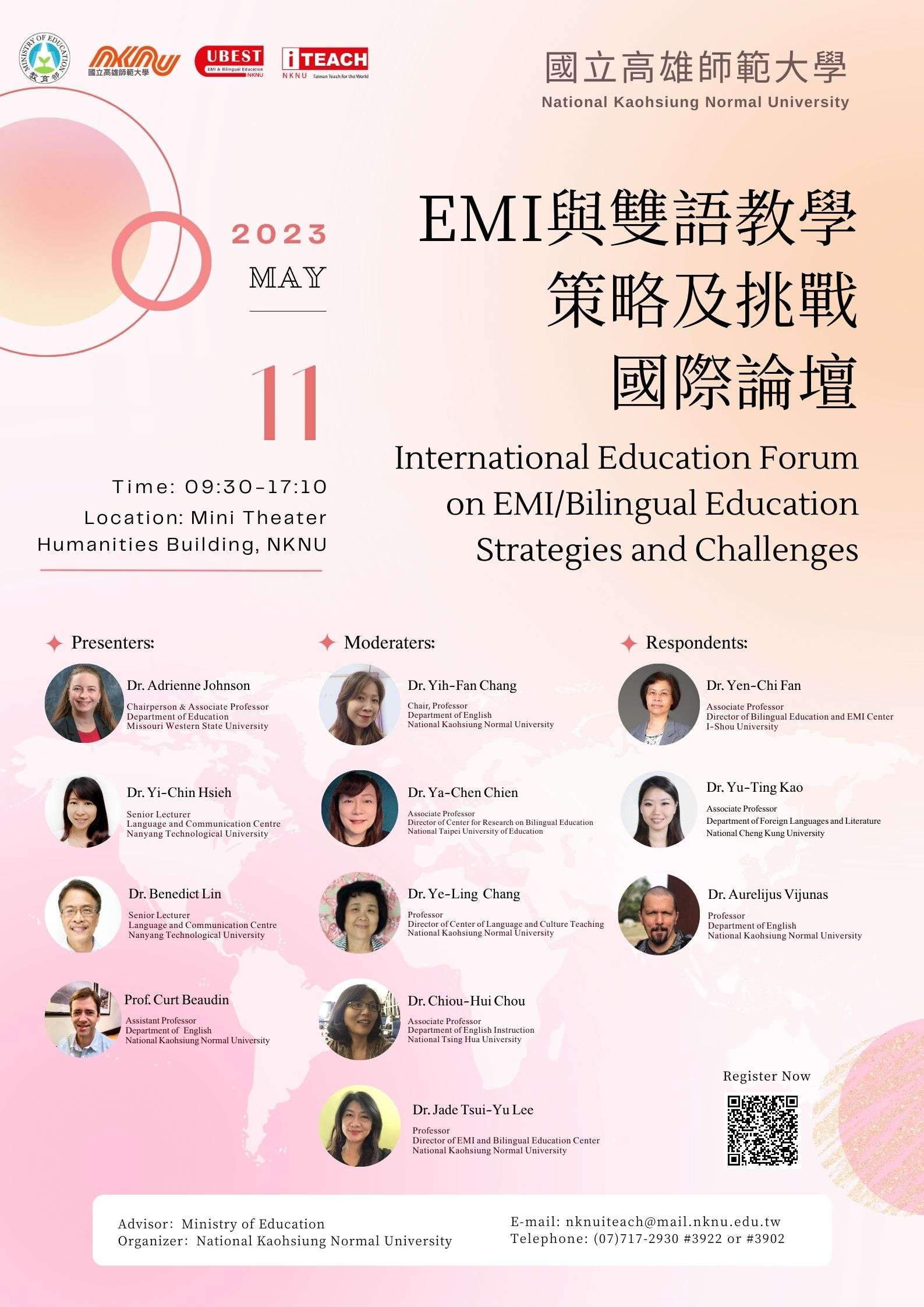 一、為配合政府推動2030年雙語教育政策,旨揭邀請美國密蘇 里西部州立大學教育系主任兼副教授Adrienne Johnson、 新加坡南洋理工大學資深講師林擇良博士、謝依縉博士與 本校英語學系柯博登助理教授共同探討EMI全英語授課及雙 語學習的實質面向及實務與因應策略,增進英語教學能力 之政策推廣。 二、活動日期與時間:112年5月11日(星期四)9:00-17:10。 三、活動地點:本校和平校區(高雄市苓雅區和平一路116號)文 學大樓B1小劇場。 四、參加對象:大專院校及中小學教師、學生、社會人士。 五、敬請各直轄市及縣市政府教育局(處)轉知所轄高中以下各 級學校。 六、檢附活動海報及議程供參。
