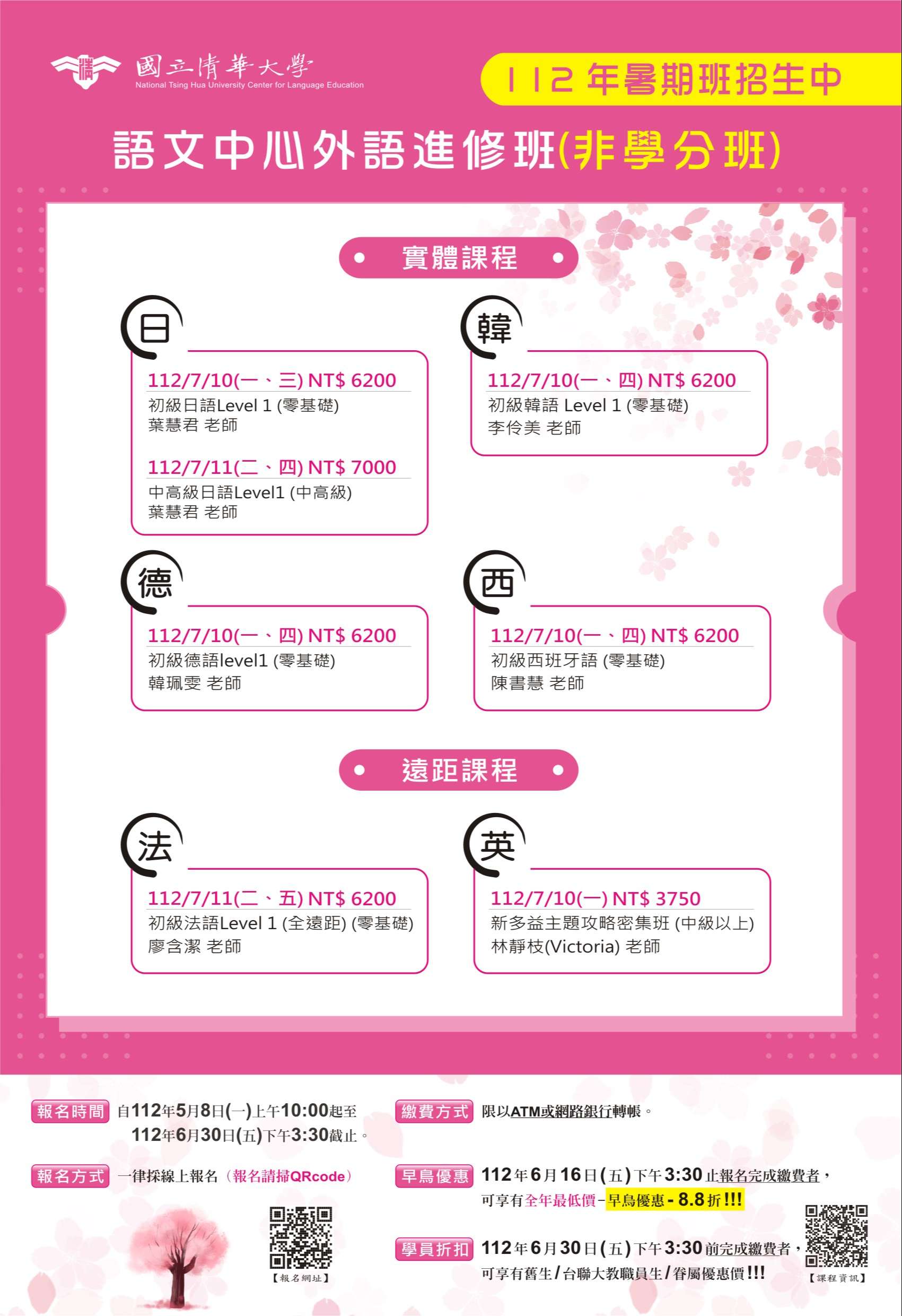 國立清華大學語文中心112年暑期外語推廣課程「自主學 習,遠距上線!」方案,請踴躍報名。