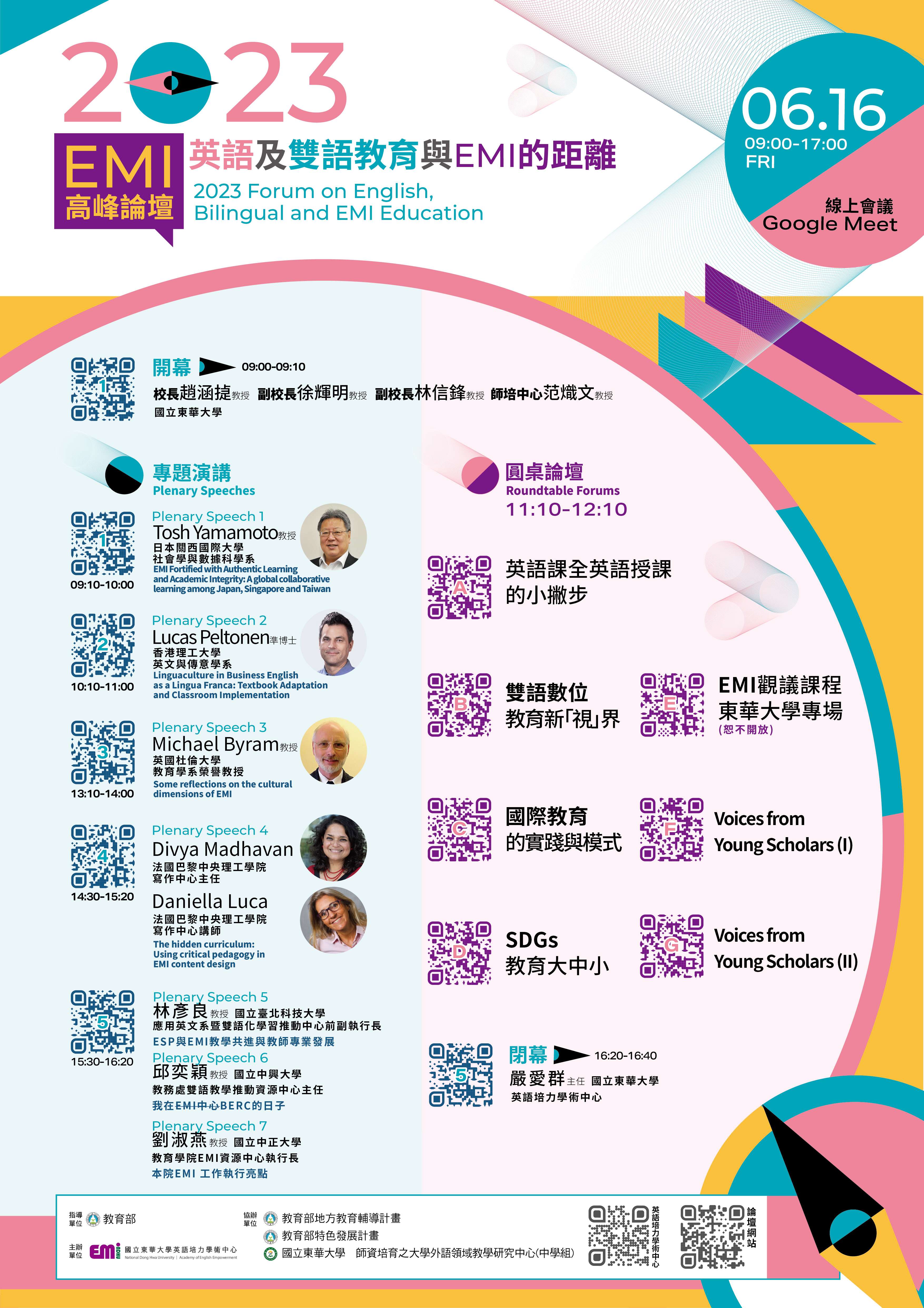 一、時間:112年6月16日(星期五),上午9時至下午5時。 二、地點:本次講座採線上會議方式辦理。 三、報名方式:採自由線上參與,活動連結請直接點選議程會 議連結或QR Code進入會議。 四、活動議程及海報請參附件。 五、本次論壇由國立東華大學外語領域教學研究中心(中學 組)與英語培力學術中心、地方教育輔導計畫及特色發展 計畫協同辦理。 六、惠請轉知相關專長、英語相關學系、師培中心、EMI教學中 心或對雙語教學有興趣之教師參與。 七、承辦人:本校英語培力學術中心培力組蔡瑩寰助理,電 話:(03)890-5908,信箱:aeepd@gms.ndhu.edu.tw