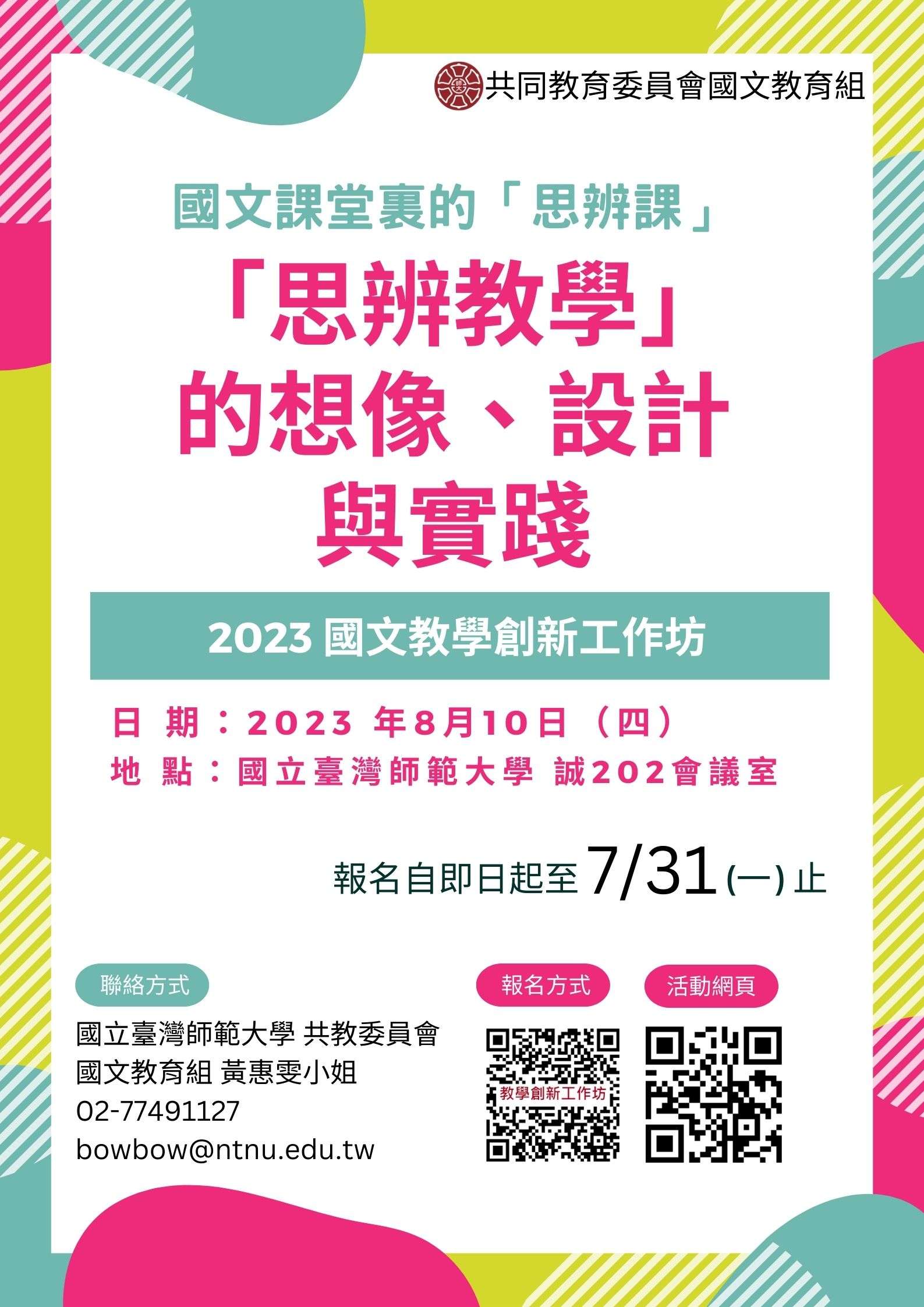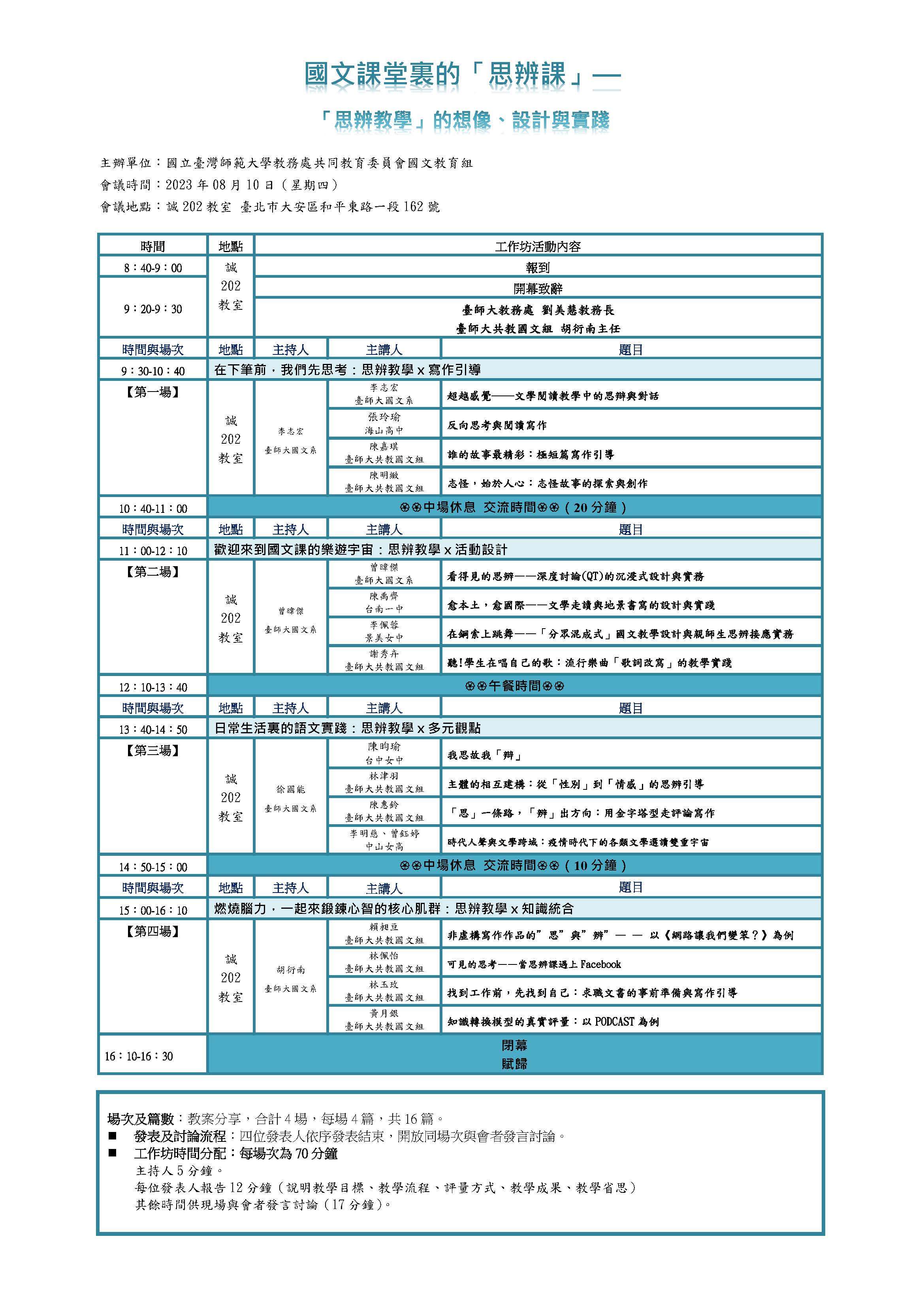 一、聽講、寫筆記為主的學習模式是不少國文教師曾走過的專 業養成之路,對於國文課堂裏「思辨課」的教材、教法與 評量,如何從自身過往學習歷程提取經驗,並轉化成清晰 的教學設計、教學實踐,便是一值得探索的教學課題。 期 望藉由本教學工作坊看見可能的答案,透過參與者的分享 與討論來探索描摹思辨教學的具體樣貌。 二、活動時間:112年8月10日(星期四)上午9時至下午16時30分 (中午提供餐盒)。 三、活動地點:本校校本部誠202教室(臺北市大安區和平東路 一段162號)。 四、本活動採網路報名,自即日起至112年7月31日(星期一)下午5時止受理報名,報名網址如下:https://forms.gle /812Uzn4NYWa7fnrM7。 五、檢送活動議程暨活動海報供參。 六、如本活動臨時調整舉辦方式,會盡速以E-mail通知報名 者。 七、本案聯絡人:本校共同教育委員會國文教育組黃惠雯小 姐,電話:02-77491127,E-mail:bowbow@ntnu.edu.tw 。