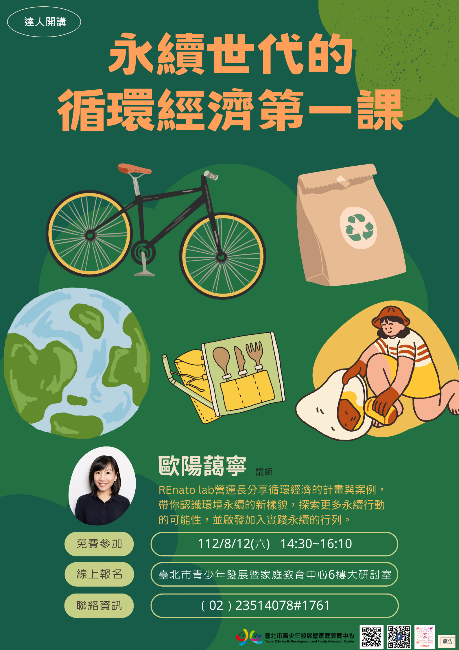 一、經由講師職涯經驗分享,讓年輕學子認識各行各業,藉以 了解自身興趣及性向,進而找到未來的道路與建立自我價 值;REnato lab營運長歐陽藹寧老師以個人經驗出發,與 青年學子分享循環經濟的計畫與案例,帶你認識環境永續 的新樣貌,探索更多永續行動的可能性,並啟發加入實踐 永續的行列。