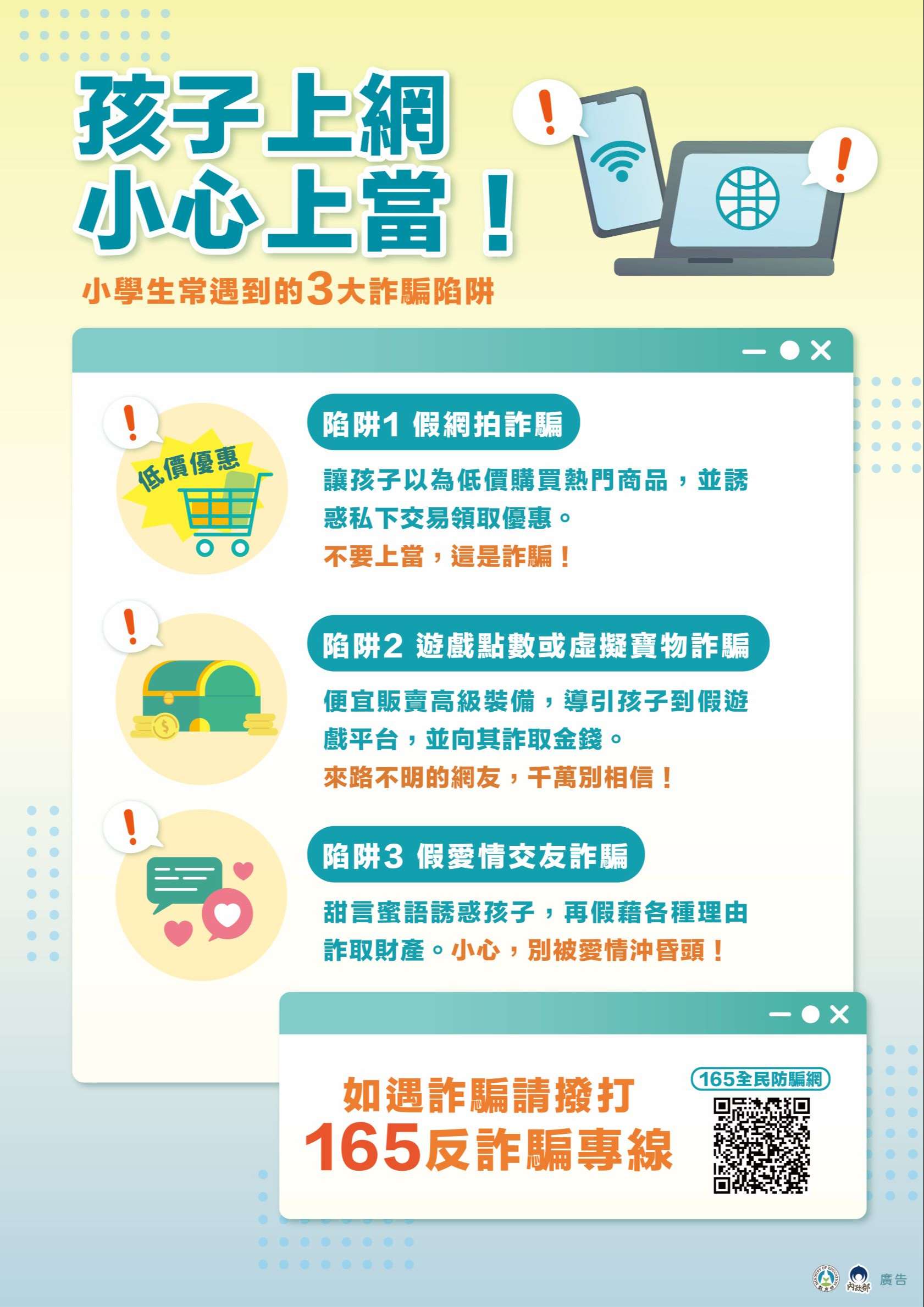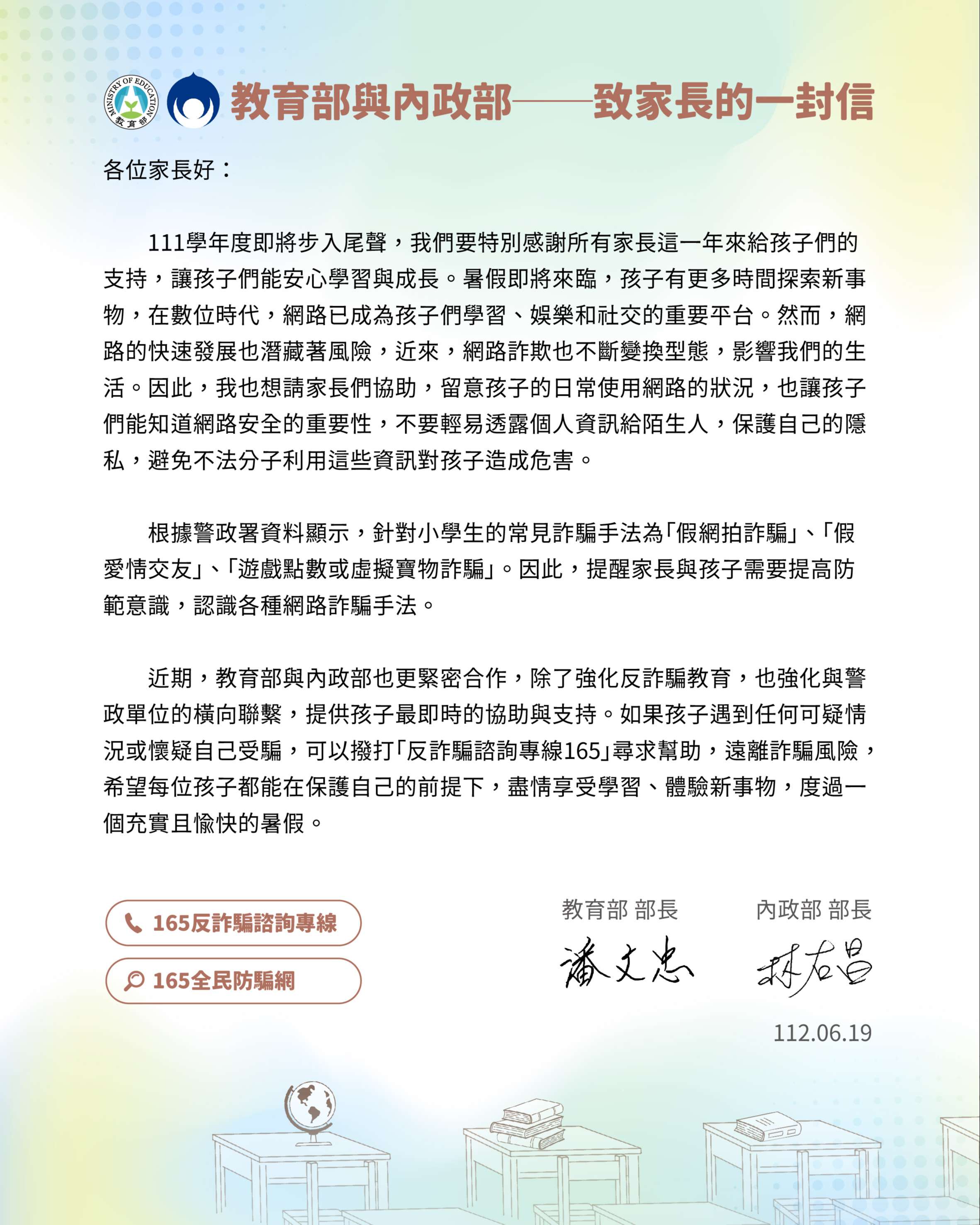 「教育部與內政部—致家長的一封信」(反詐騙宣導),請參閱附件檔案,提升學生及家長識詐之能力,避免成為詐騙受害者。