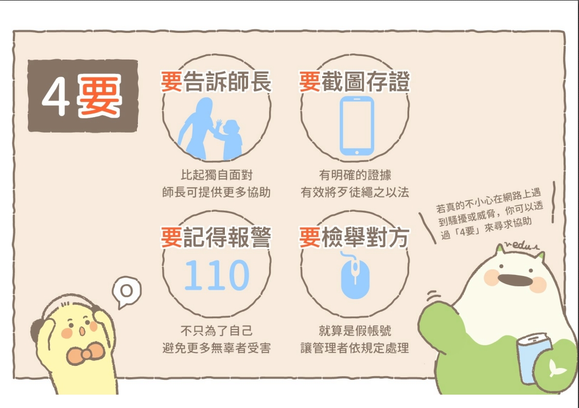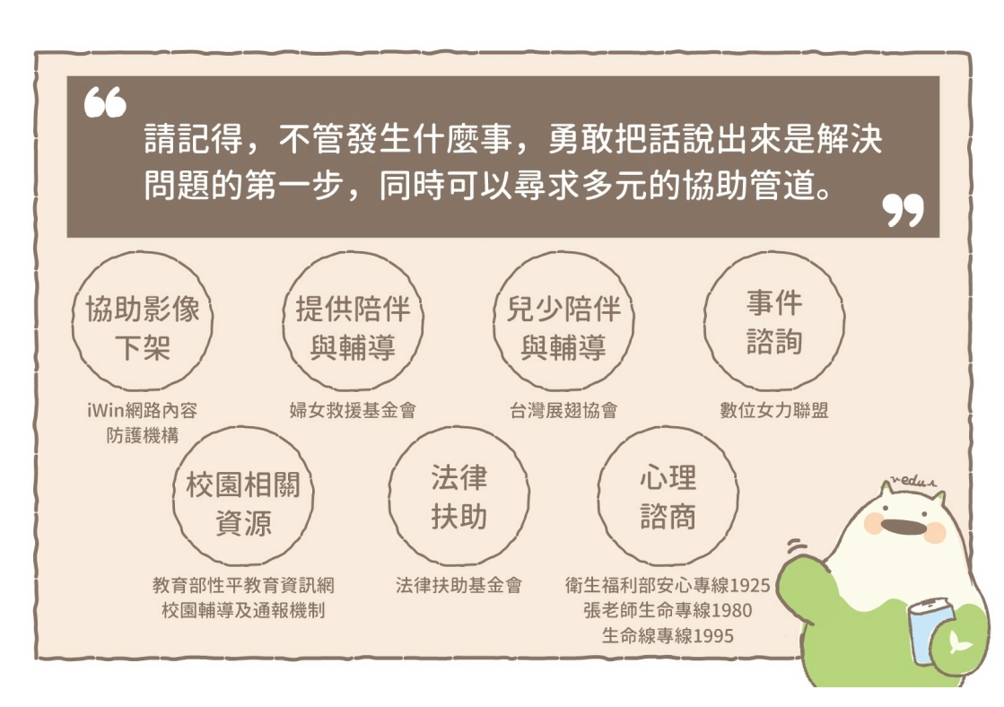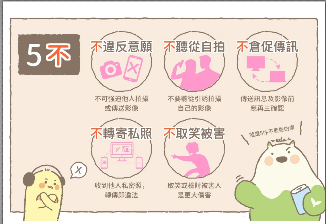 謹記性影像防治五不二要:「不偷拍、不偷錄、不點閱、不下載、不散布;要求助、要下架」。