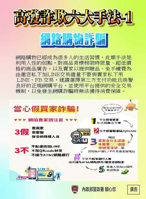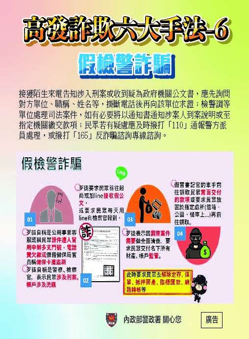 內政部警政署「30秒識詐短影音」宣導系列短片及「6大高發詐欺手法」宣導圖文: