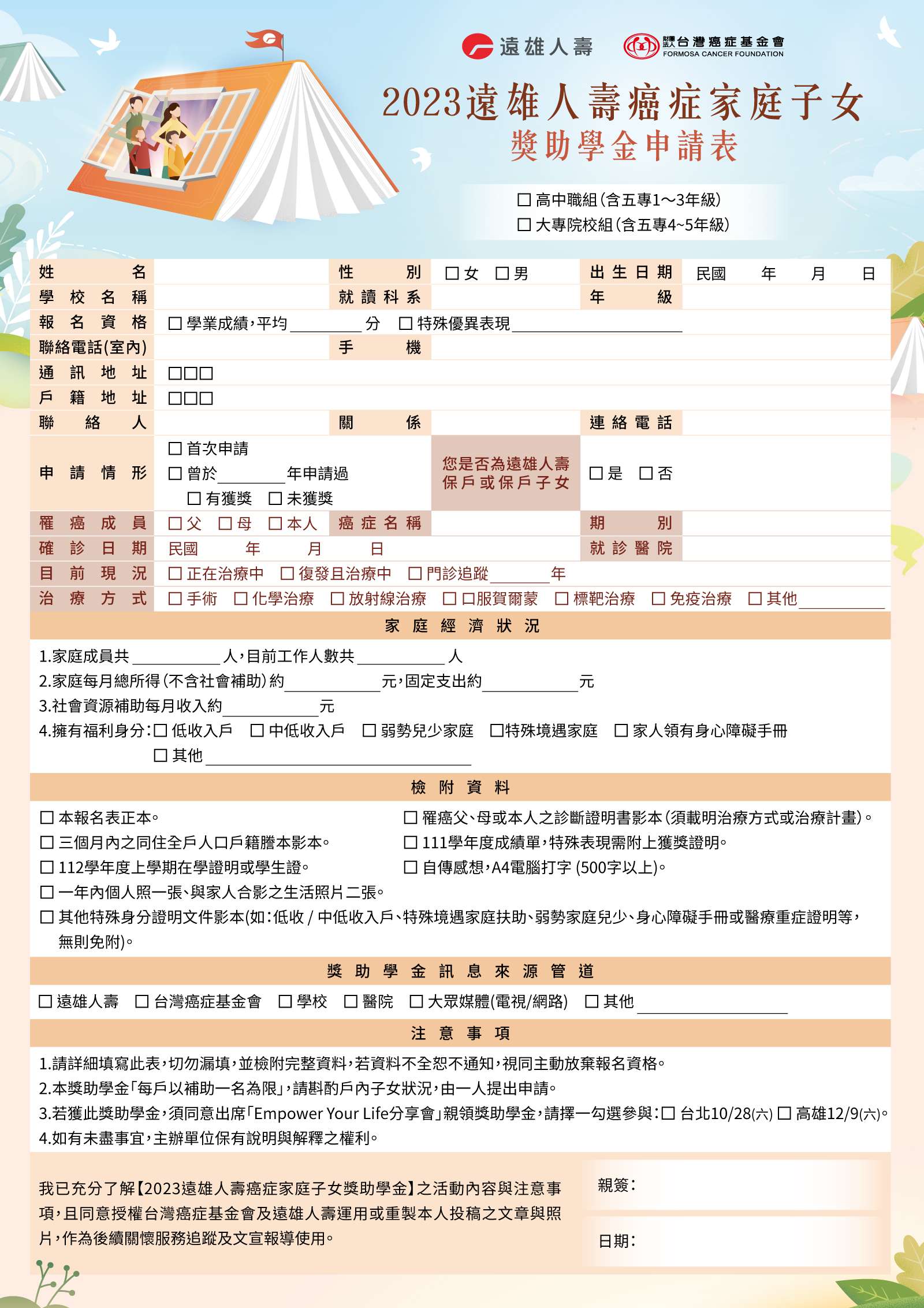 二、本會特規劃「2023台灣癌症基金會x遠雄人壽-癌症家庭子女獎助學金」活動,針對高中職與大專院校之在學學生,提供獎助學金,期藉此減輕癌症家庭之經濟壓力,亦讓其子女們在獎助學金的鼓勵下,感受社會對癌症家庭的支持,更激發其積極向上求學之心。