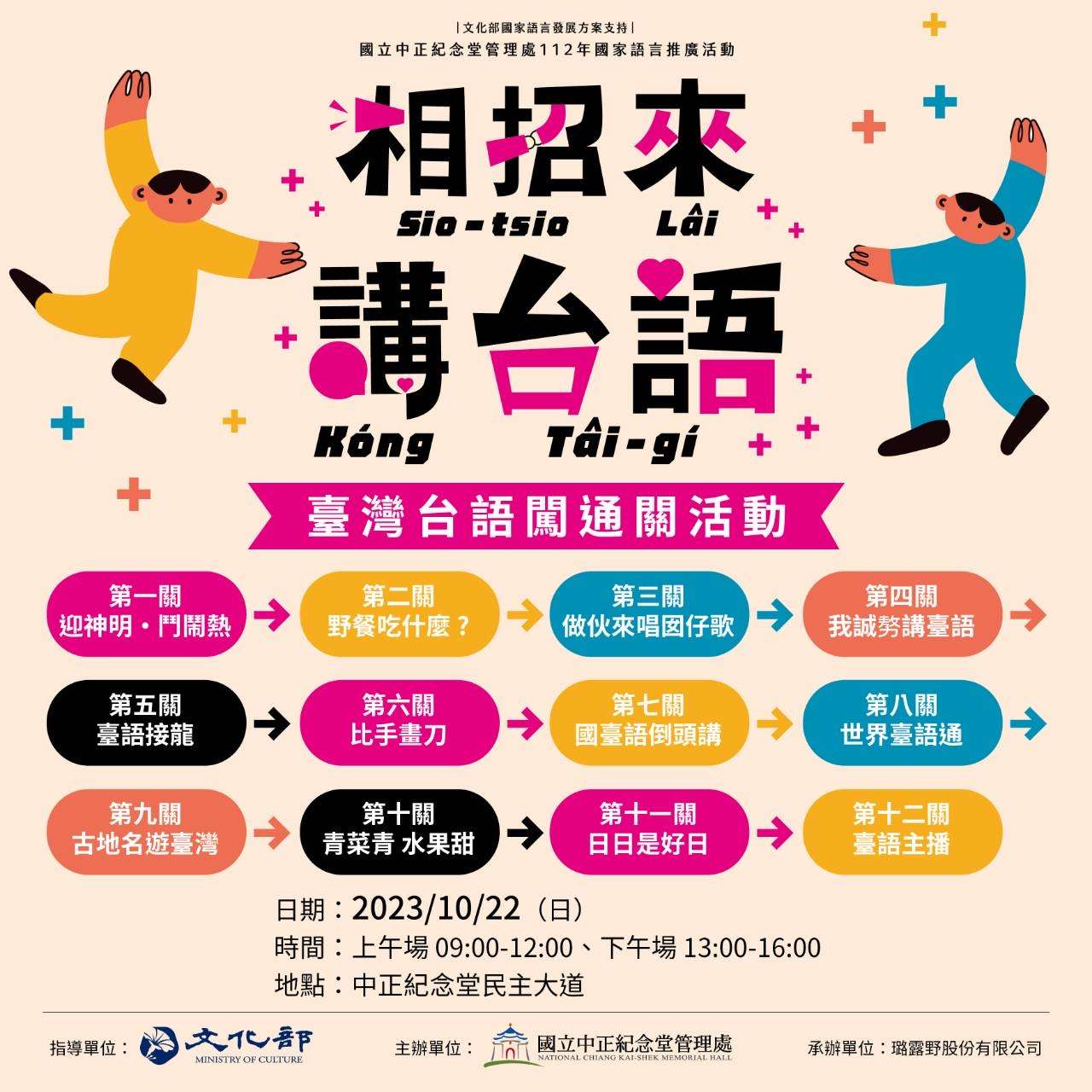 一、為落實國家語言文化深耕,本處訂於112年10月22日(星期 日)假本處民主大道舉辦「相招來說台語」臺灣台語闖通 關活動,共有12道關卡,分成「藝術文化、旅遊美食、歷 史故事、日常生活、運動及新聞時事」等主題類別,讓參 與民眾用台語進行闖關挑戰,透過遊戲學習台語。 二、旨揭闖關活動分為上午場(上午9時至12時)及下午場(下 午1至4時),闖關成功者可獲得紀念品1份,闖關卡及紀念 品限量1千份,發完活動即止,歡迎各界踴躍參加。 三、活動詳情可上本處官網活動網頁查詢(網址: https://event.culture.tw/mocweb/reg/CKSMH/Detail. init.ctr? actId=31093&utm_source=moc&utm_medium=queryReg&utm_ campaign=31093)。附本活動宣傳圖檔。