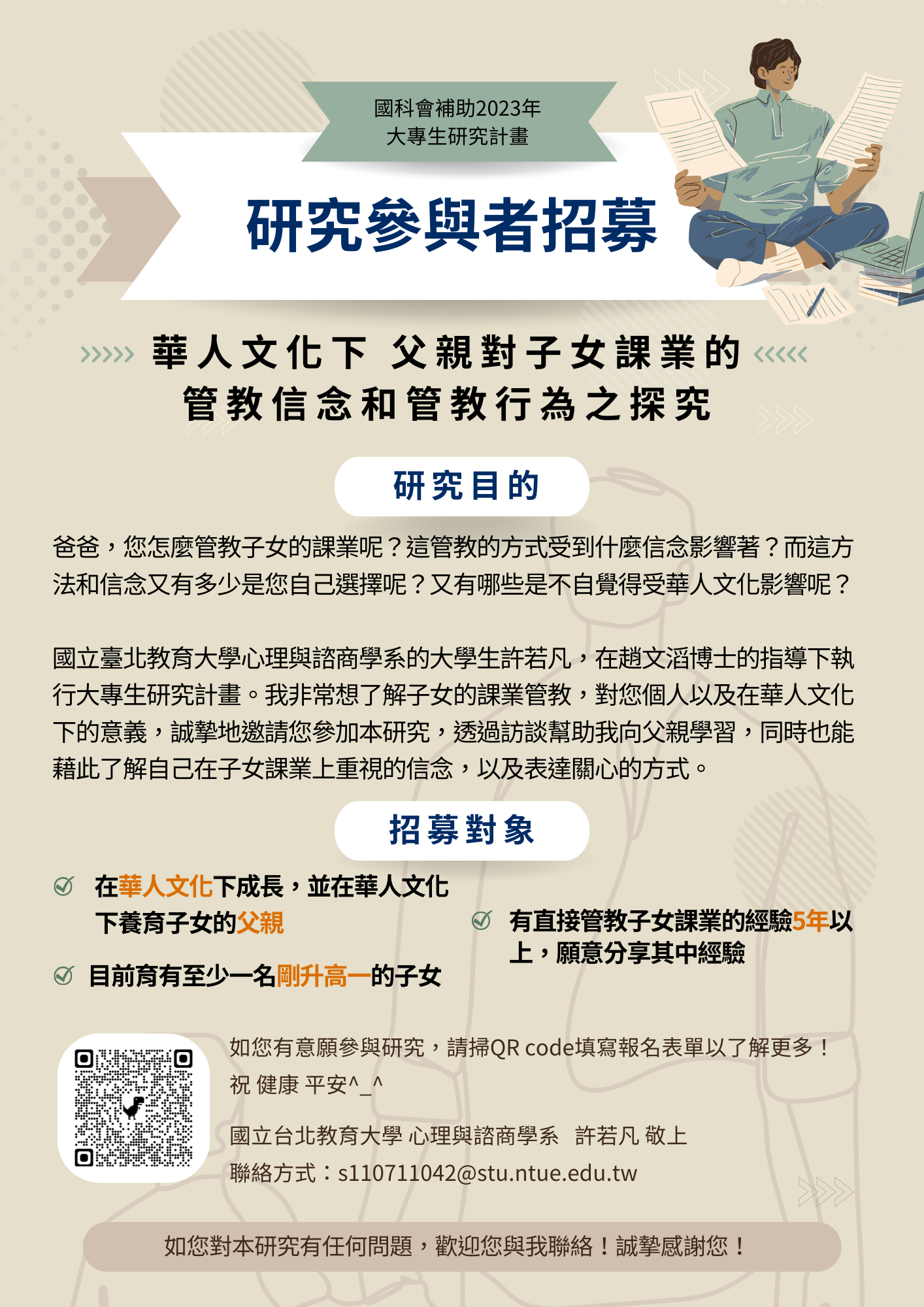 一、計畫名稱:以「課業為名」的愛?華人文化下父親對子女 課業的管教信念和管教行為之探究(計畫編號:112-2813- C-152-024- H)。
