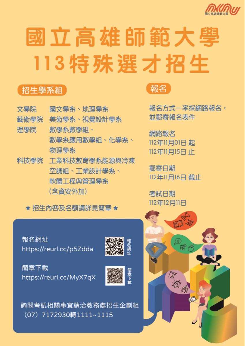 主旨:檢送本校113學年度大學「特殊選才」招生簡章,敬請轉 知貴校學子並鼓勵踴躍報名,請查照。