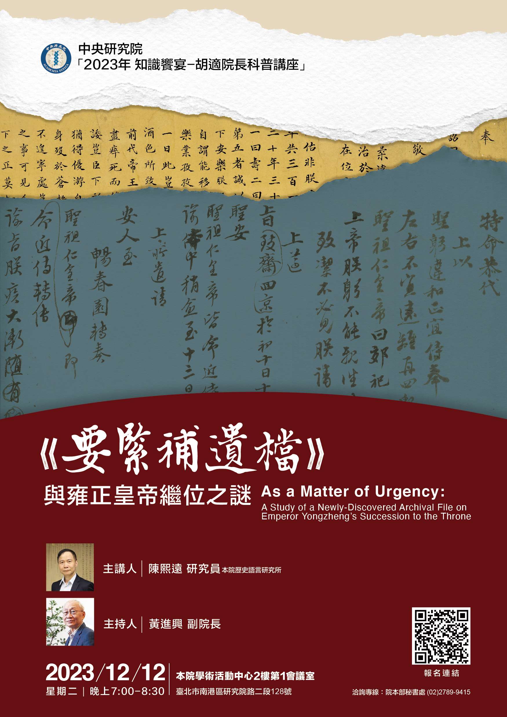 一、本院為紀念胡故院長適之先生132歲冥誕,舉辦「知識饗 宴-胡適院長科普講座」,特邀請本院歷史語言研究所陳 熙遠研究員以「《要緊補遺檔》與雍正皇帝繼位之謎」為 題演講(活動海報如附件)。 二、講座時間:本年12月12日晚間7時至8時30分,地點:本院 學術活動中心2樓第1會議室。 三、報名網址:https://conference.iis.sinica.edu.tw /Activity/list.jsp 四、歡迎於本年12月10日前報名參加現場演講,注意事項如 下: (一)本次演講影片將於活動後上傳本院YouTube(無線上直 播)。(二)活動採線上報名,開放30位當日現場報名名額,活動當 晚6時於會場接待處開始登記,額滿為止。 (三)若因故無法出席,請於12月10日前自行於線上取消報 名,以免影響日後報名權益。 五、參加現場演講者將提供: (一)現場報到即贈送科普出版品,數量有限送完為止。 (二)活動期間免收停車費(請出示報名參加信)。 (三)公務人員參與可獲得終身學習時數1小時,教師1.5小 時。 六、洽詢專線:院本部秘書處高先生 (02) 2789-9415。