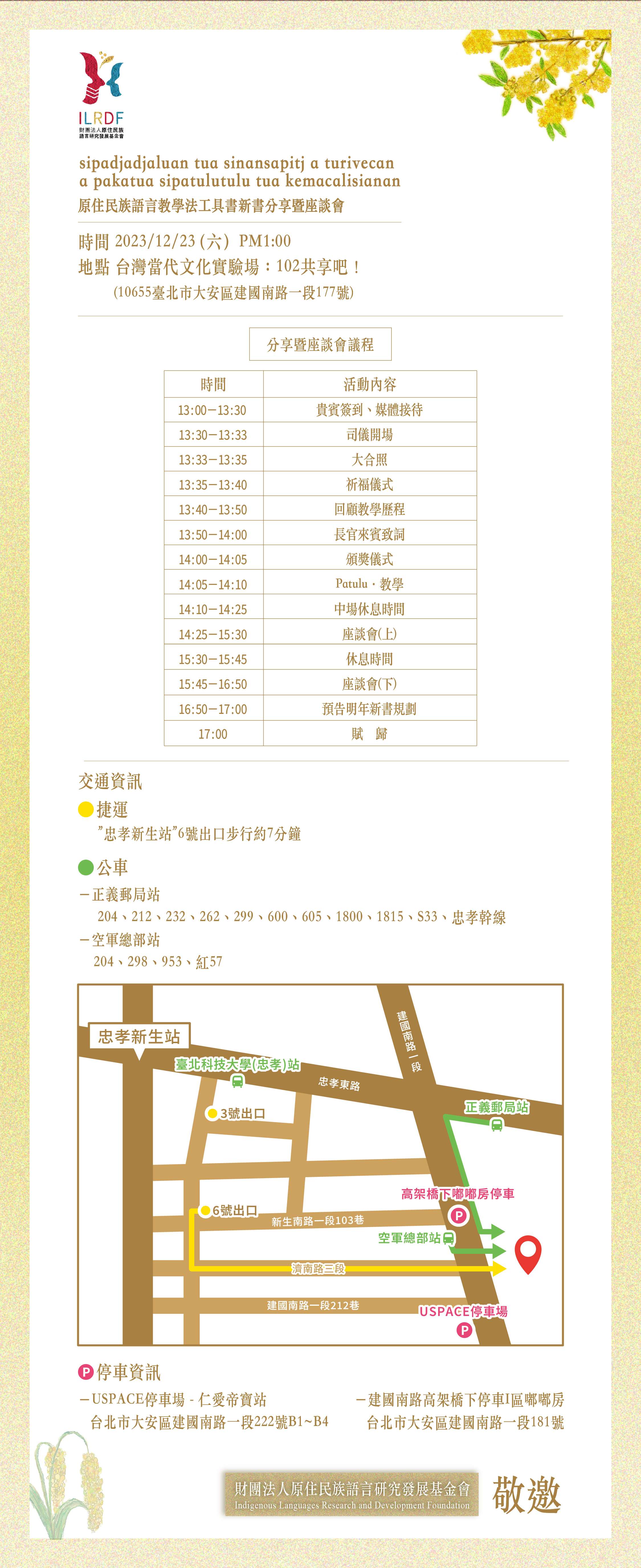 一、依據財團法人原住民族語言研究發展基金會112年12月21日 原語教字第1120003865號函辦理。 二、活動資訊: (一)活動日期:112年12月23日(星期六)下午13時30至17 時。 (二)活動地點:臺灣當代文化實踐場:102共享吧 (臺北市 大安區建國南路1段177號)。 (三)活動對象:各校教師、職員、學生、對族語有興趣之民 眾。 (四)活動人數:70人。 (五)聯絡電話:陳暳陵助理研究員02-23418508分機709。 三、檢附本次活動邀請卡1份。