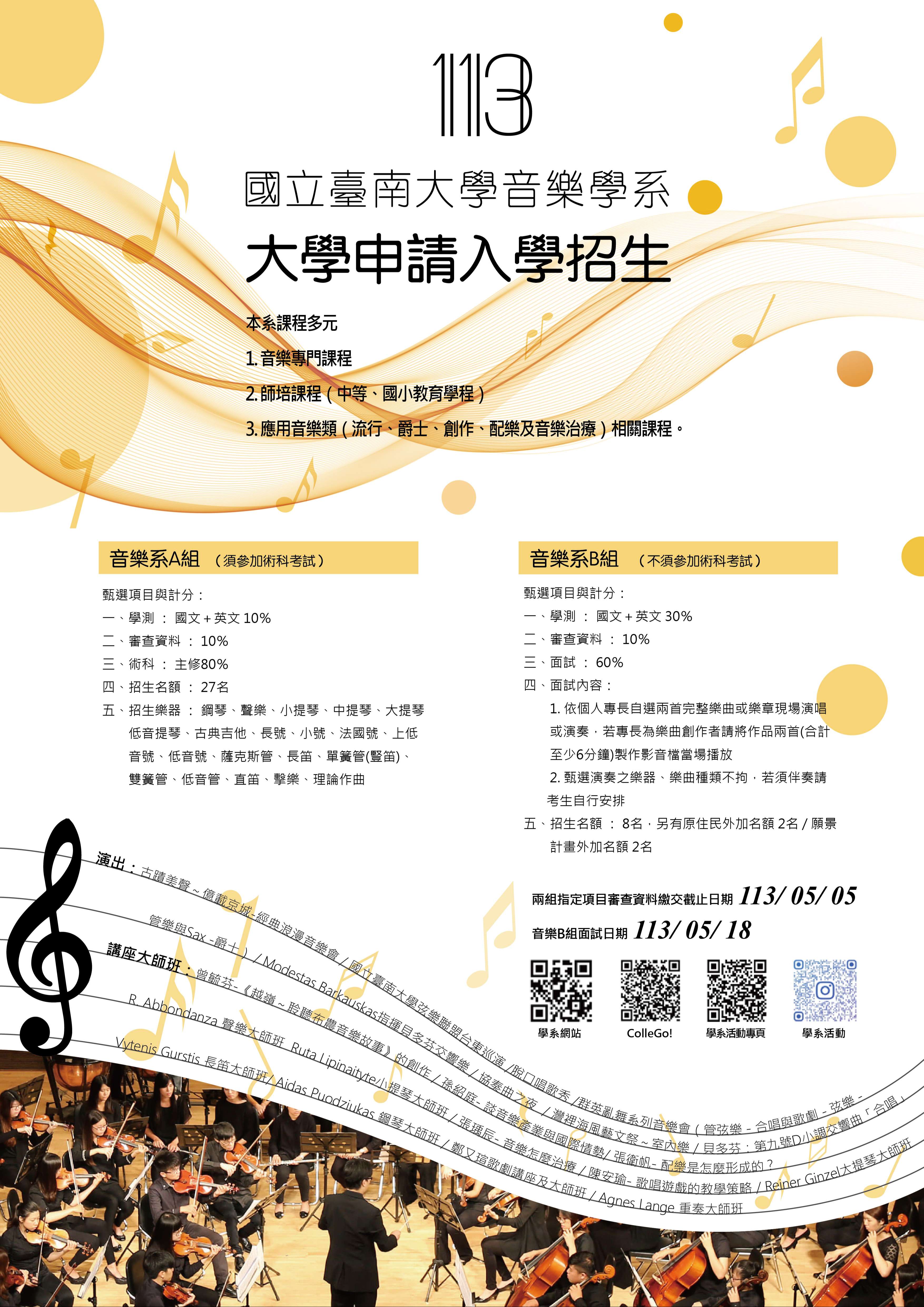 一、本系113學年度起於申請入學階段分組招生,音樂系A組採 計全國音樂術科成績,B組不採計全國音樂術科成績,藉此 將擴大招生對象。