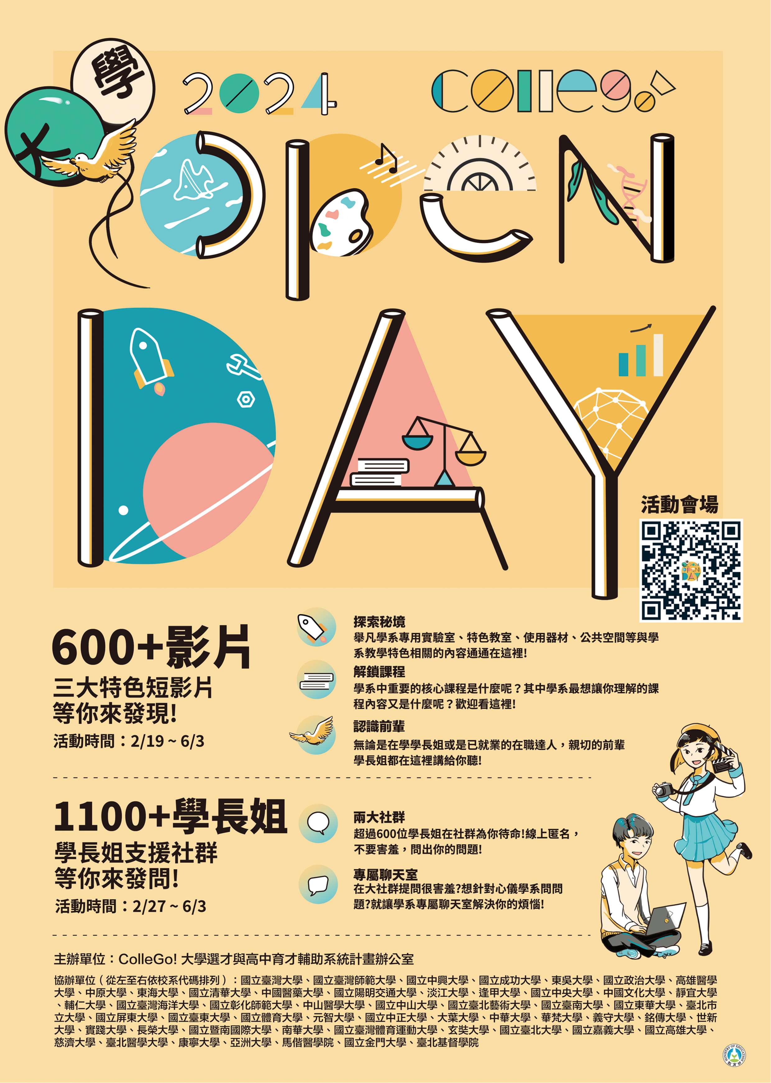 三、為因應本次活動需求,ColleGo!網站中增設OPEN DAY線上 活動會場。線上活動會場之網路連結及本活動相關訊息, 請見海報上QRCODE或ColleGo!網站內之「焦點話題」 (https://collego.edu.tw/Media/portfolio)