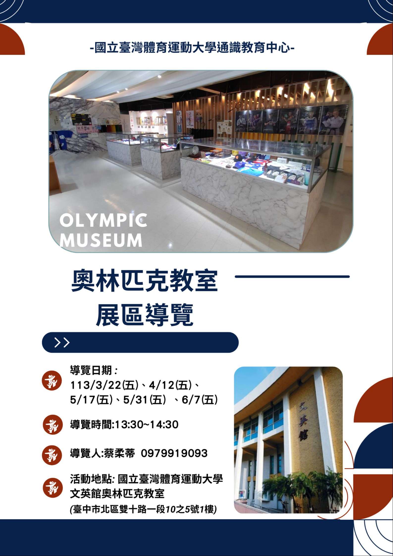 一、為推廣奧林匹克精神與理念,本校奧林匹克教室免費導覽解說,開放時間為113年3月22日、4月12日、5月17日、5月31日、6月7日週五13:30至14:30。