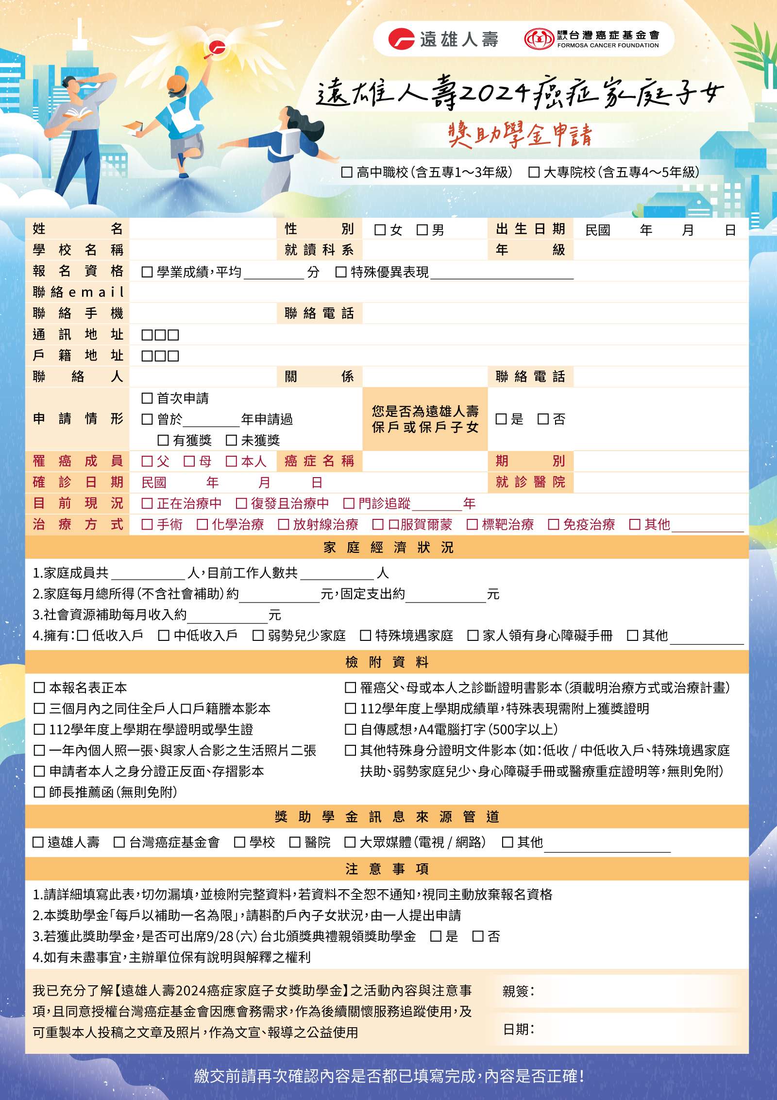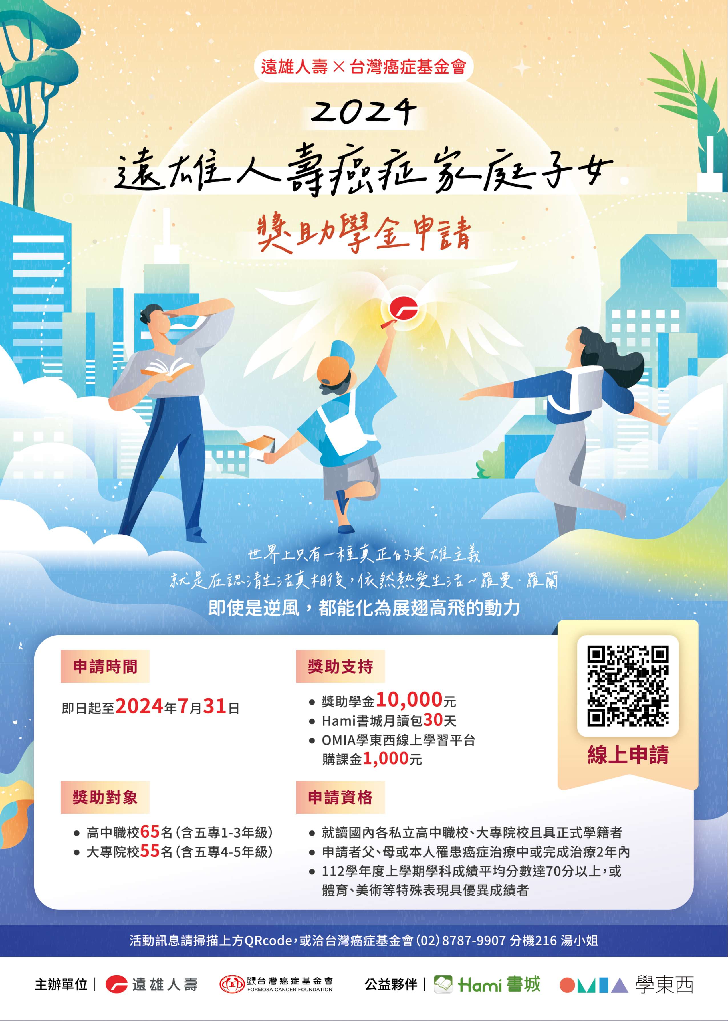二、本會特規劃「2024台灣癌症基金會x遠雄人壽-癌症家庭子 女獎助學金」活動,針對高中職與大專院校之在學學生, 提供獎助學金,期藉此減輕癌症家庭之經濟壓力,亦讓其 子女們在獎助學金的鼓勵下,感受社會對癌症家庭的支 持,而更激發其積極向上求學之心。