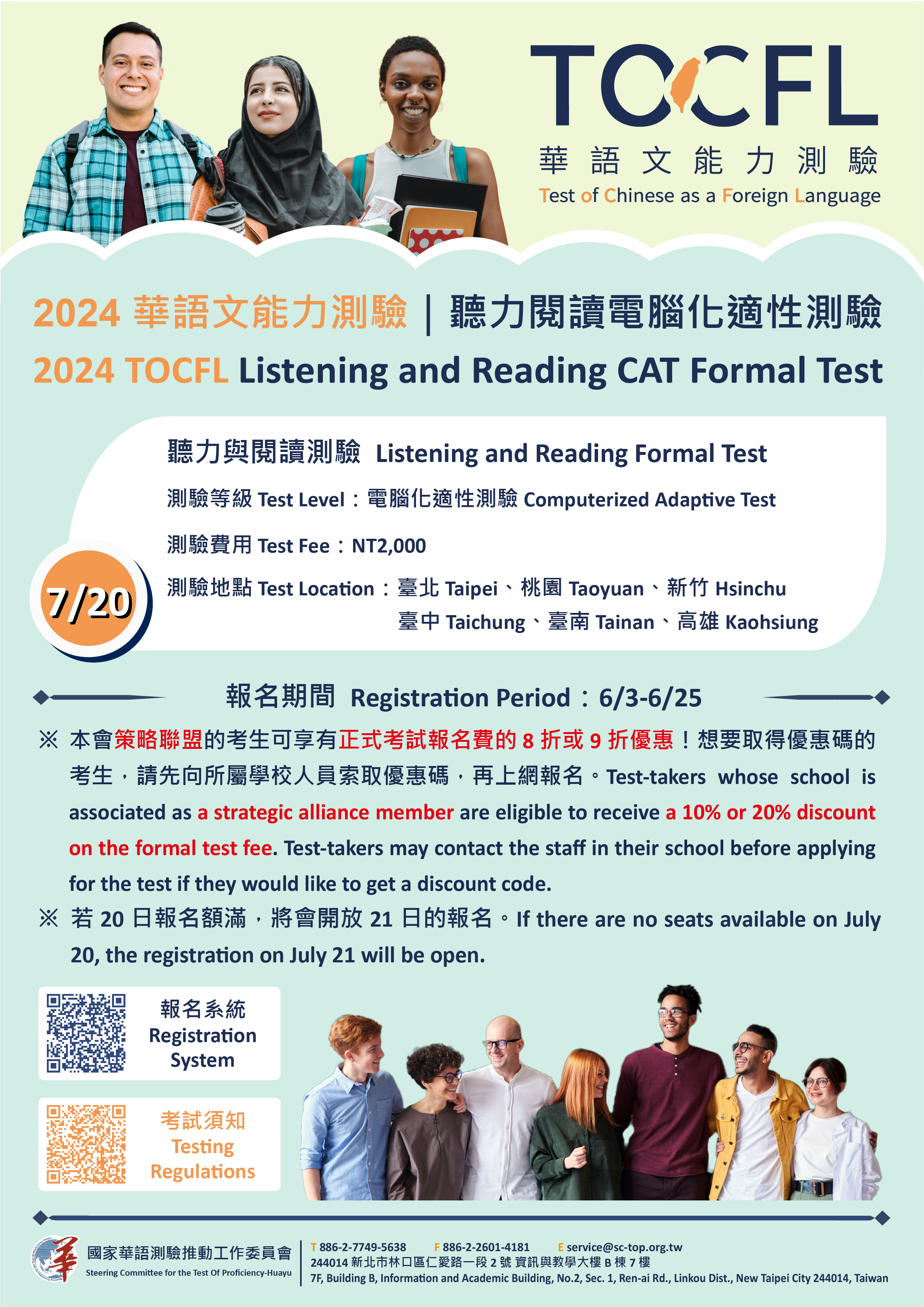 一、依據國家華語測驗推動工作委員會113年6月4日華測字第 1132000079號函辦理。 二、報名時程:113年6月3日(星期一)至6月25日(星期二) 止,報名截止日後,若有剩餘名額,將開放追加報名至6月 28日(星期五)止。 三、考試日期:113年7月20日(星期六)。若星期六場次額 滿,將加開7月21日(星期日)場次。 四、考試項目:聽讀測驗—電腦化適性測驗。 五、測驗費用:新臺幣2,000元。 六、優惠訊息:為該會策略聯盟單位,所屬外籍人士可享九折 優惠。 七、報名網址:https://reg.sc-top.org.tw/。八、線上模擬測驗:https://tocfl.edu.tw/index.php/exam /test/page/19。 九、檢附旨案宣傳海報1份。