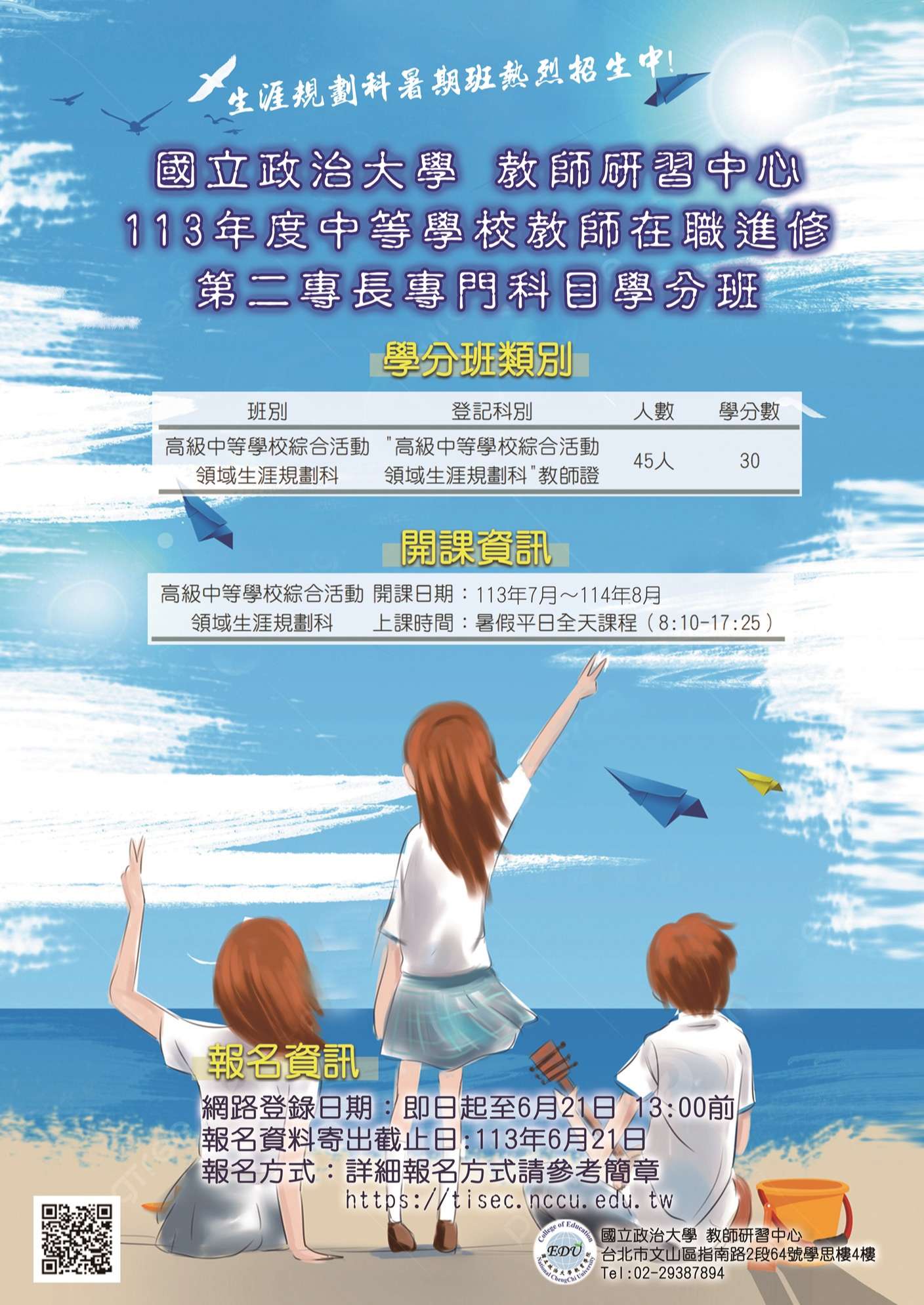 一、依教育部113年3月15日臺教師(三)字第1130027690號函核 定辦理本班。 二、為提供中等學校具合格教師證書且在職之專任、代理 (課)及兼任教師進修第二專長專門科目以增進專業知 能、完成個人職涯規劃,特辦理本學分班。 三、修畢本課程全部專門科目學分且成績及格者,可依師資培 育法施行細則第五條規定,申辦第二專長加科登記,線 由 中央主管機關發給教師證書。 四、本校畢業或本中心結業學員可申請隨班附讀。 五、本班尚有招生名額,敬請惠予公告並轉知貴屬教師踴躍報 名。六、正班及隨班附讀網路報名登錄至113年6月21日(星期五) 13:00止,詳細資訊請參閱所附簡章內容或至本校教師研 習中心網頁( http://tisec.nccu.edu.tw )查詢。聯絡 電話:(02)2938-7894。