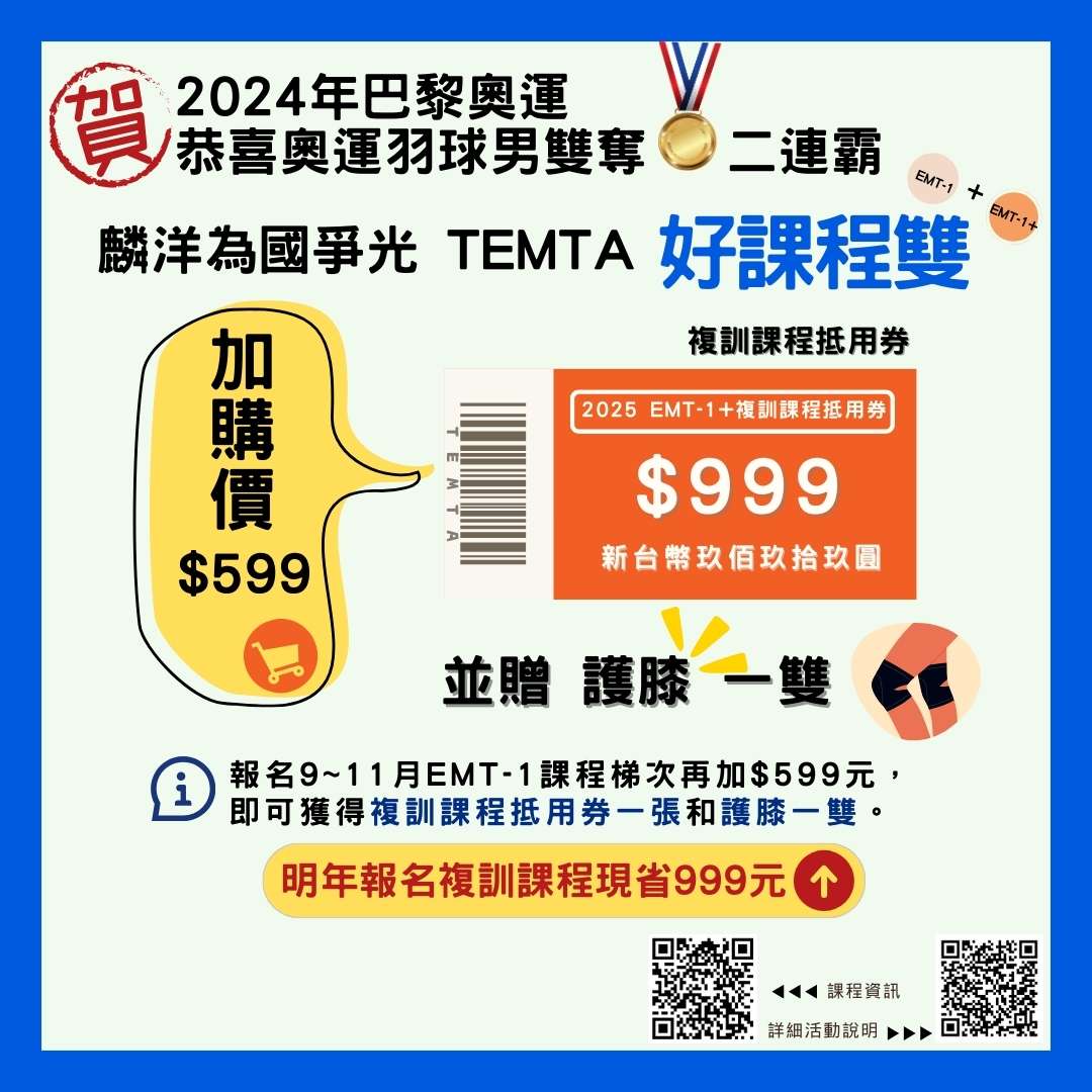 一、即日起報名9月至11月EMT-1之課程梯次,報名學員可以$599元加購複訓課程抵用券(面額$999元)並贈護膝一雙。(附件1)