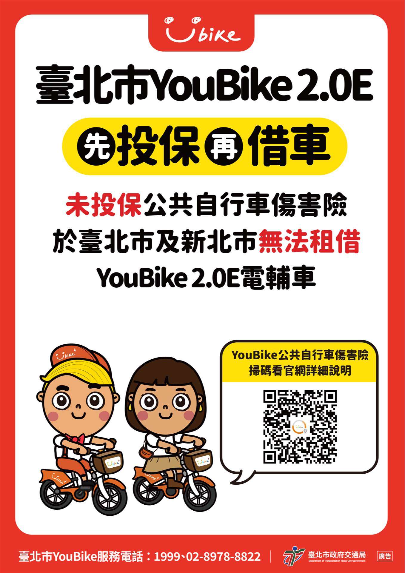 為強化宣導於本市騎乘公共電動輔助自行車YouBike2.0E 前須先投保公共自行車傷害險,詳見附件宣導海報。