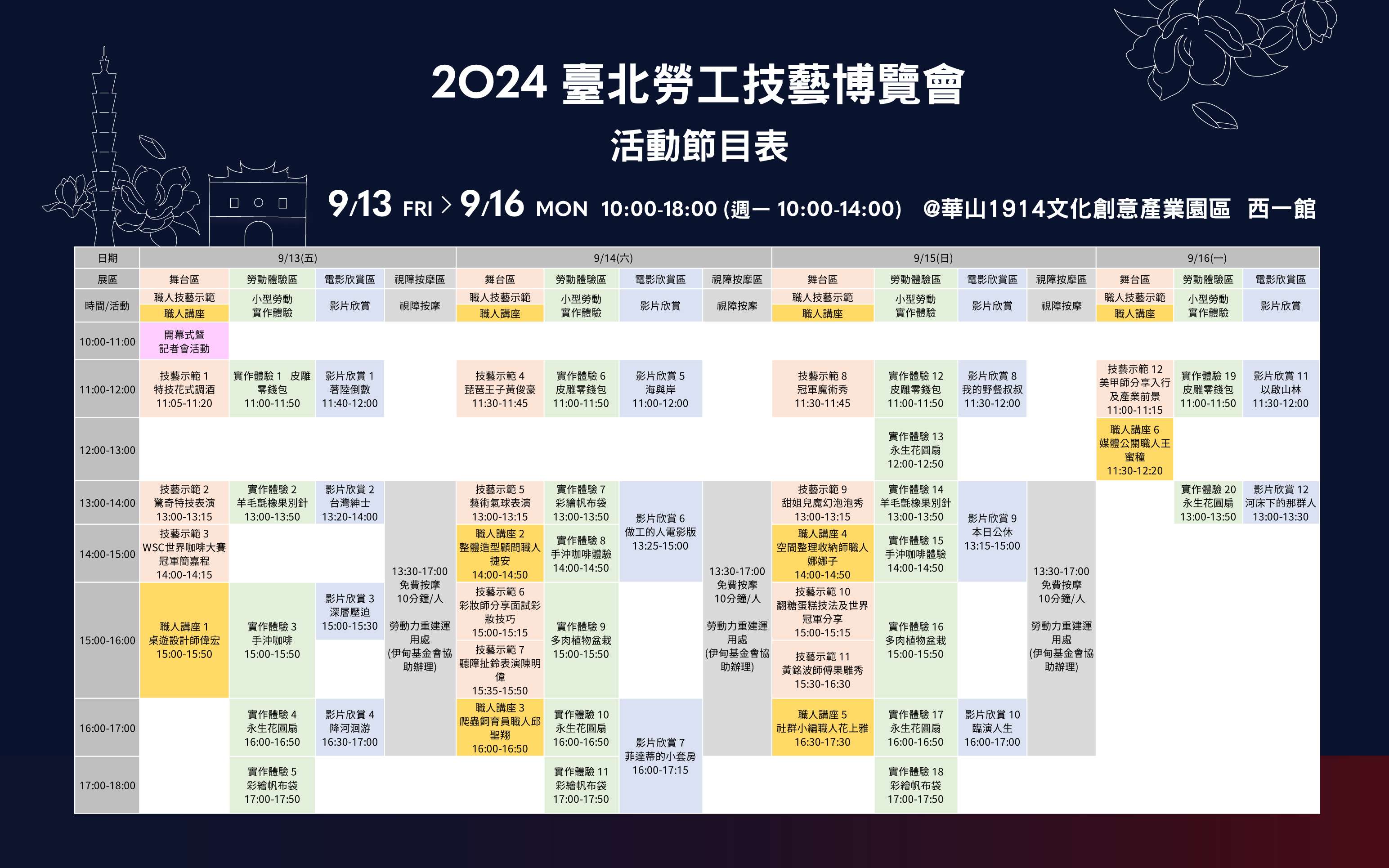 一、為傳承勞工技藝與彰顯職人精神,本局於113年9月13日至9 月16日假華山文創園區西1館(臺北市中正區八德路1段1 號)舉辦旨揭活動(免費入場),今年主題「技傳佰四, 藝氣風發」,響應臺北建城140週年,百工職人聯袂展現超 高技藝。