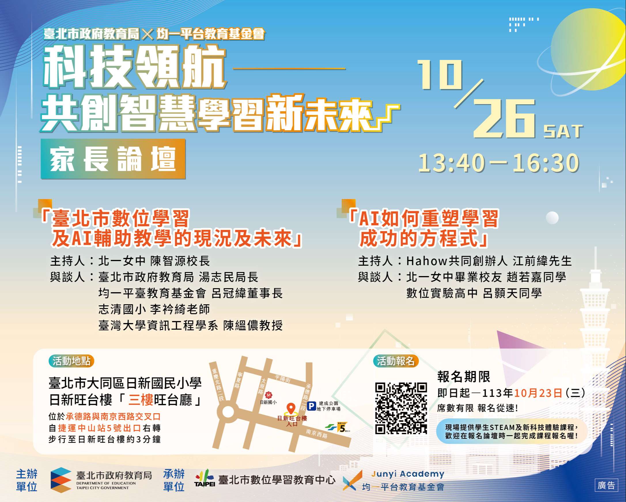 本市為推動科技輔助自主學習、創新學習及AI輔助教學, 特別辦理「科技領航–共創智慧學習新未來」家長論壇活動,與家長說明科技輔助學習政策推動現況、邀集專家學者、第一線教師與家長進行論壇: