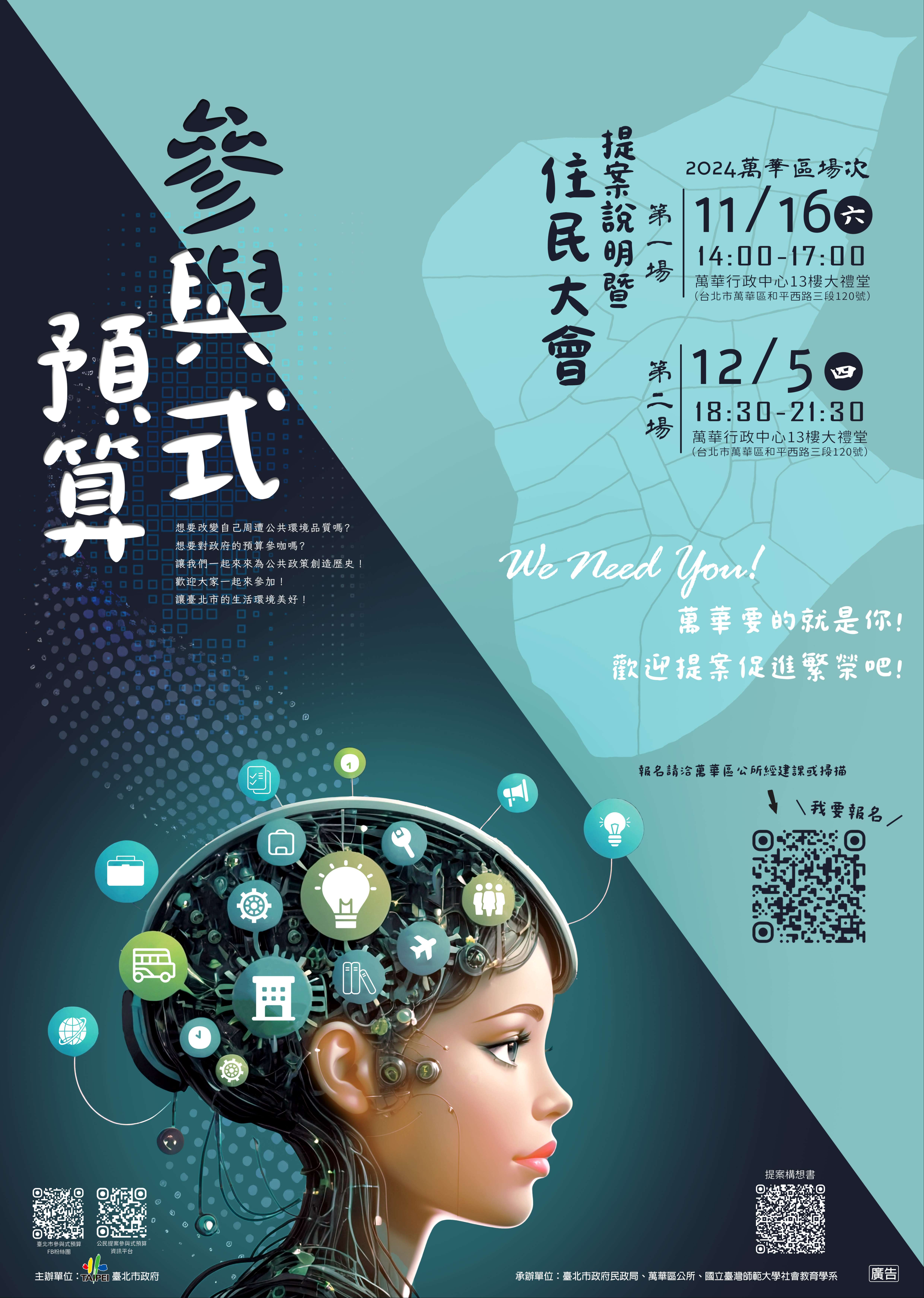 一、臺北市萬華區公所辦理「114年參與式預算提案說明會暨住民大會」一般場次資訊如下: