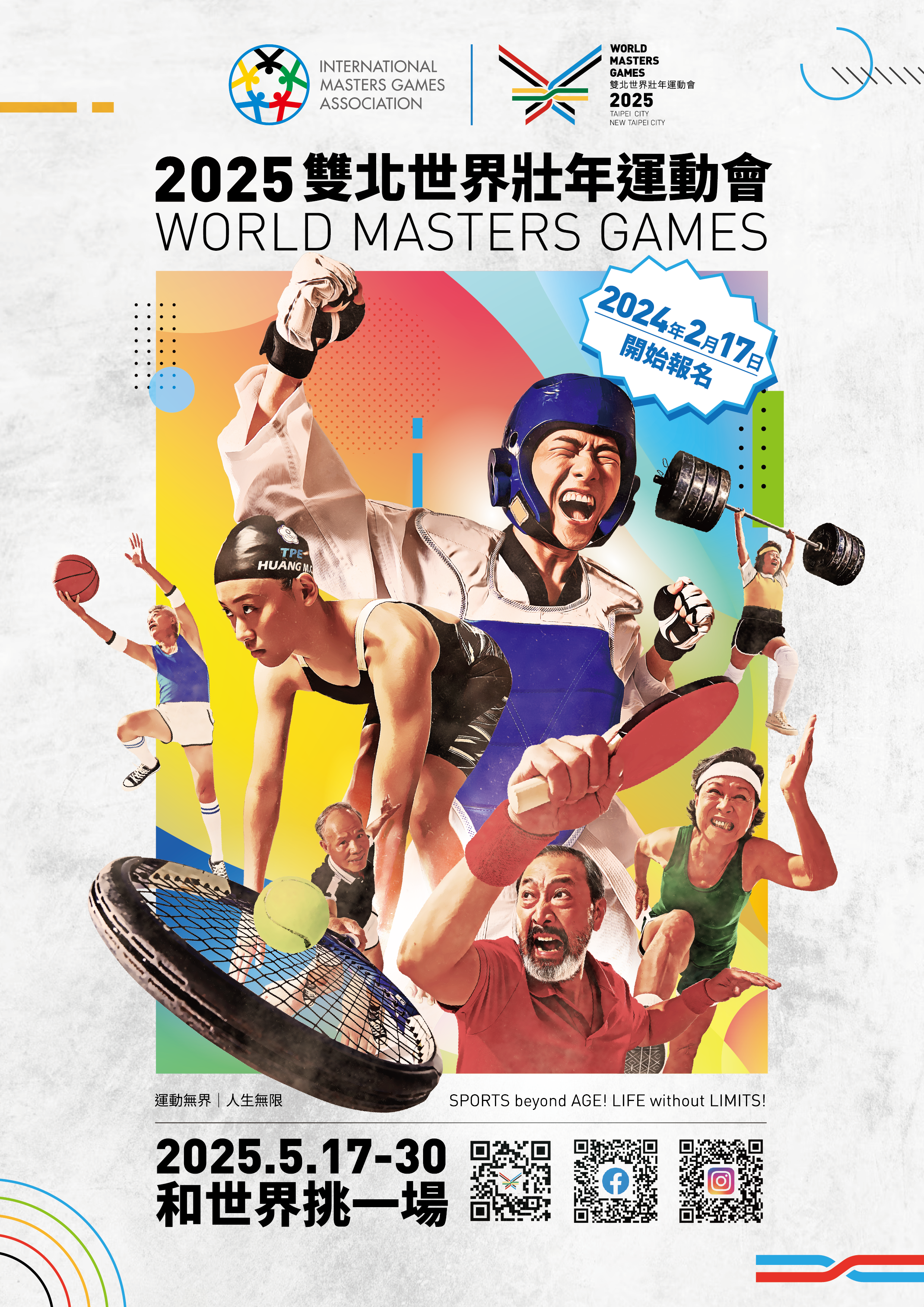 2025雙北世界壯年運動會於2025年5月17至30日舉行,共有35種運動種類其中包含帕拉運動組別,年滿30歲無需選拔即可參賽,今年2月17日官網開放報名,等你一起和世界挑一場!