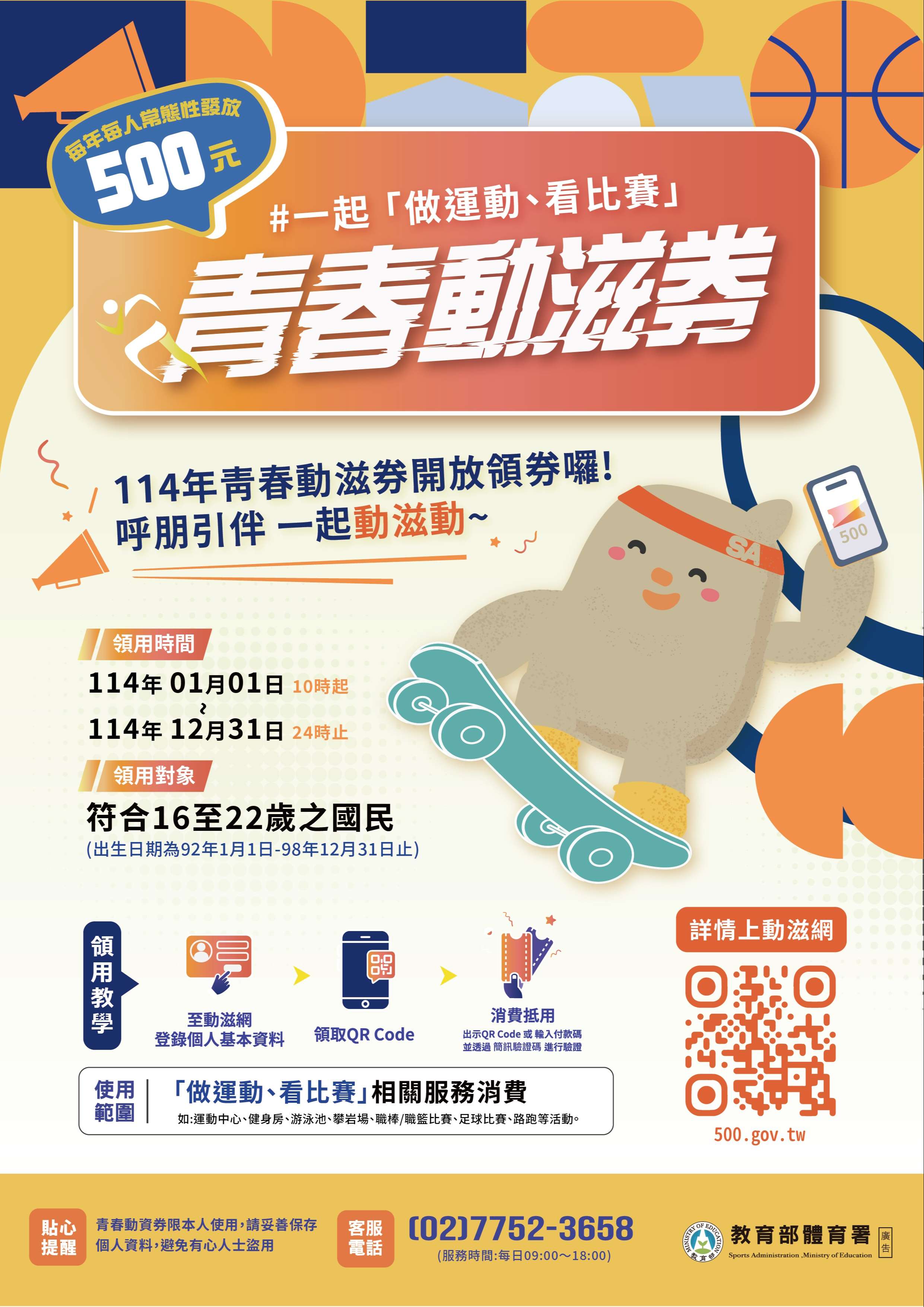 教育部體育署為鼓勵青年族群積極參與體育活動及觀賞賽事,每年常態性發放16 歲至22 歲的民眾每年每人500 元「青春動