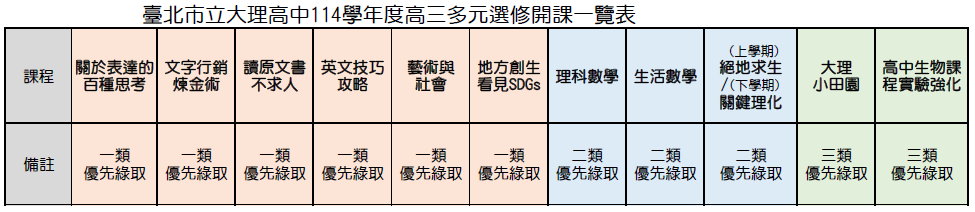 114學年度將開設跑班課程-高三多元選修,注意事項如下: