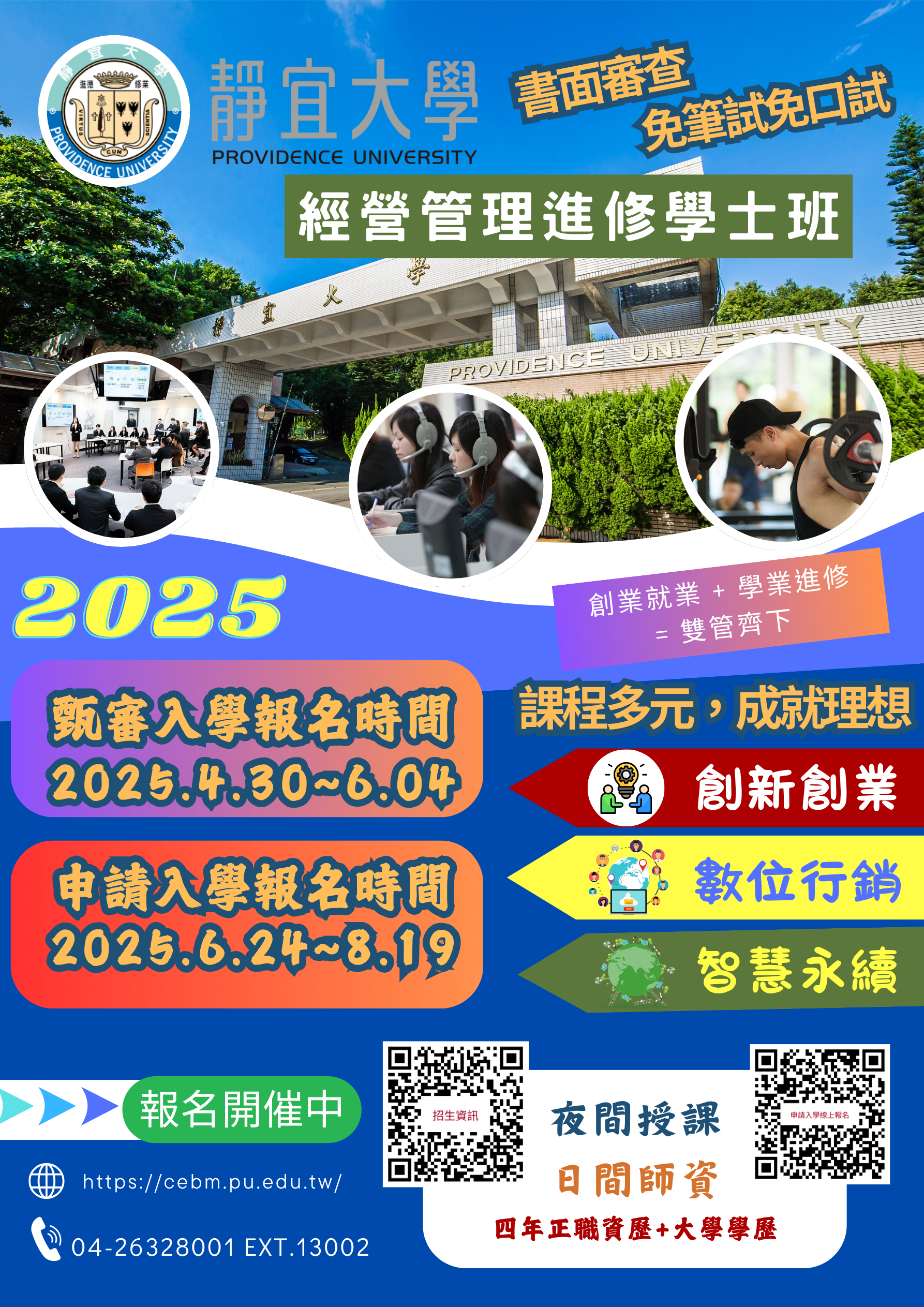 一、本校經營管理進修學士班經教育部核定自114學年度起恢復招生,第二階段申請入學自114年6月24日10:00起至8月19日24:00止開放網路報名。
