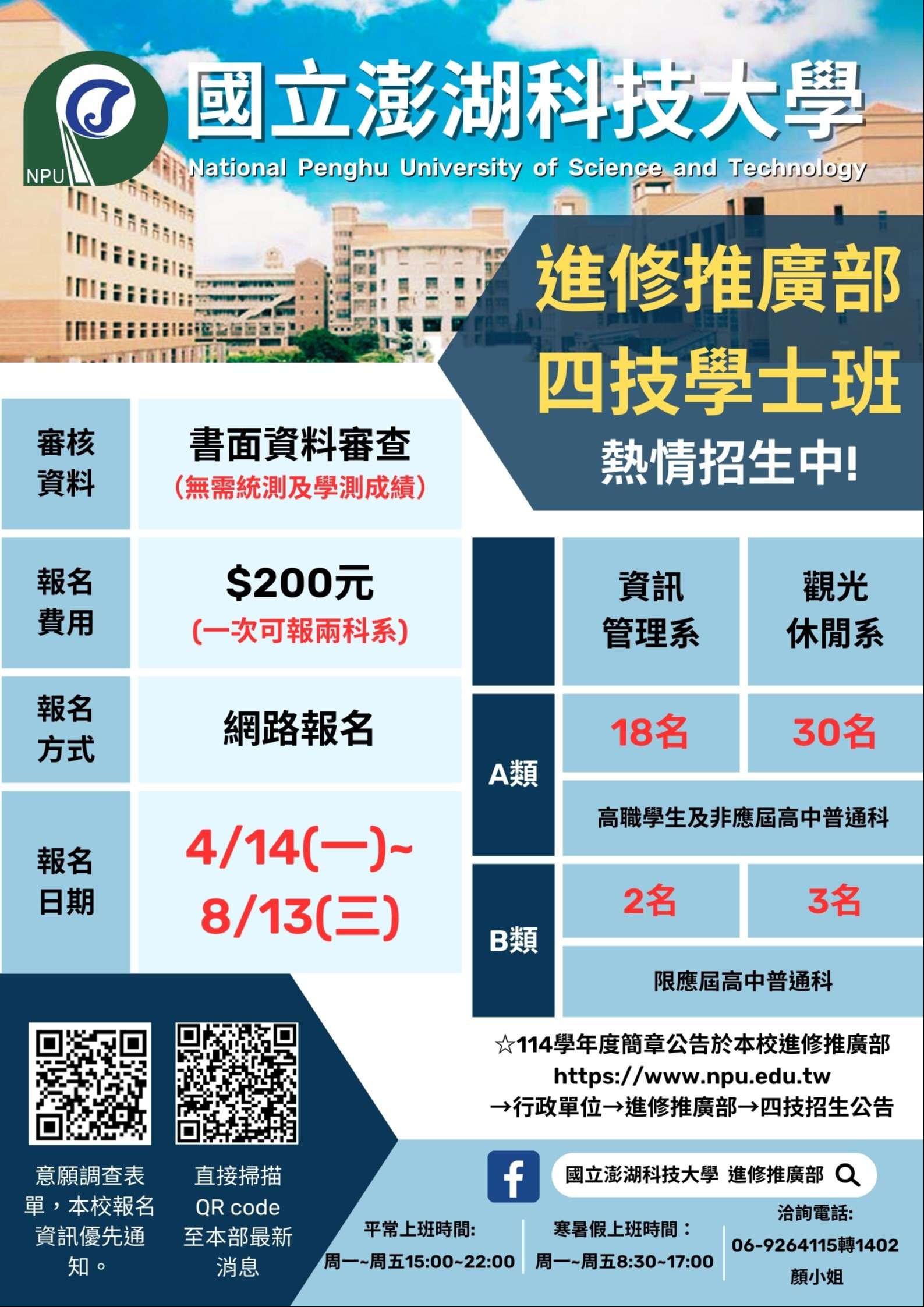二、招生名額:觀光休閒系A類招收30名、B類招收3名;資訊管理學系A類招收18名、B類招收2名。A類考生係指非應屆高中生;B類考生係指應屆高中生。