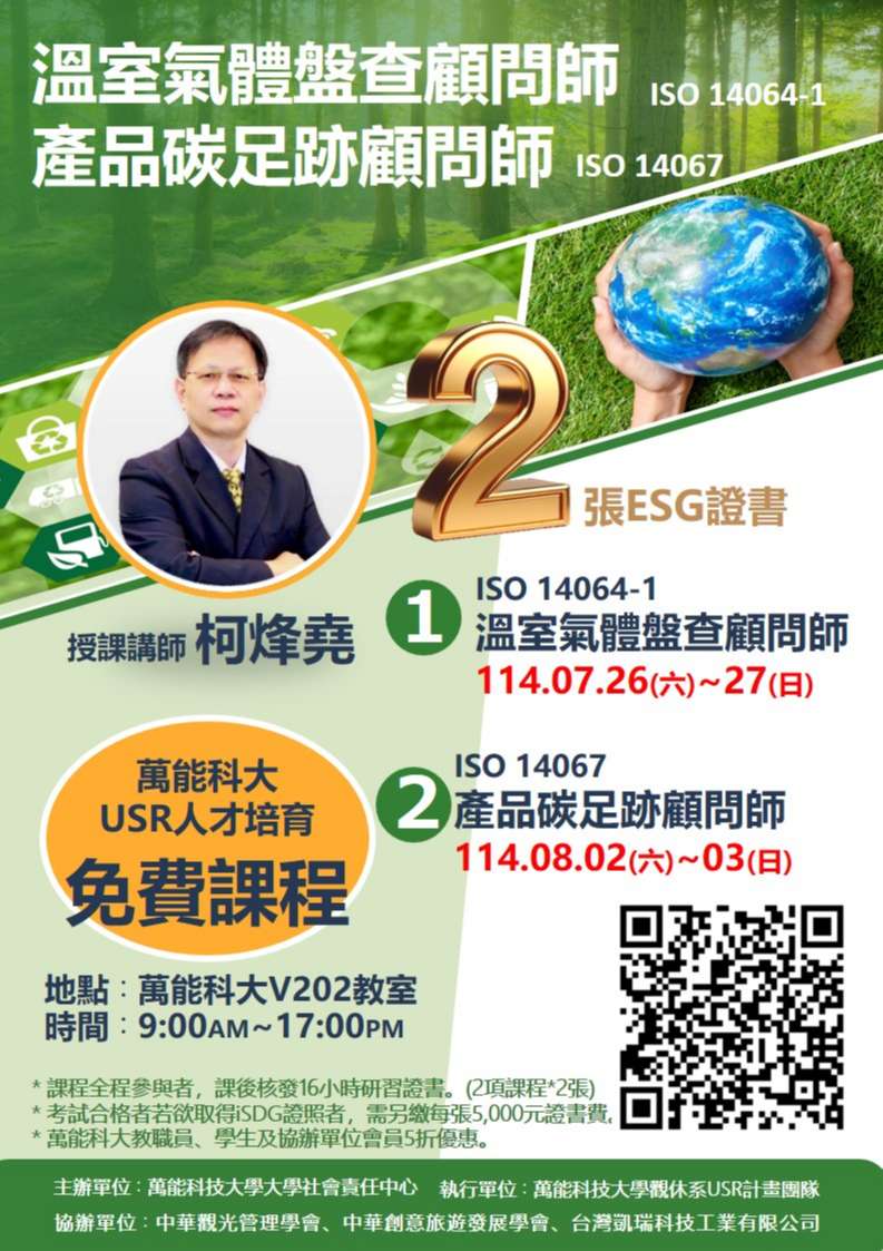 (一)ISO 14064-1溫室氣體盤查顧問師:訂於114年7月26日 (六)至27(日)辦理。