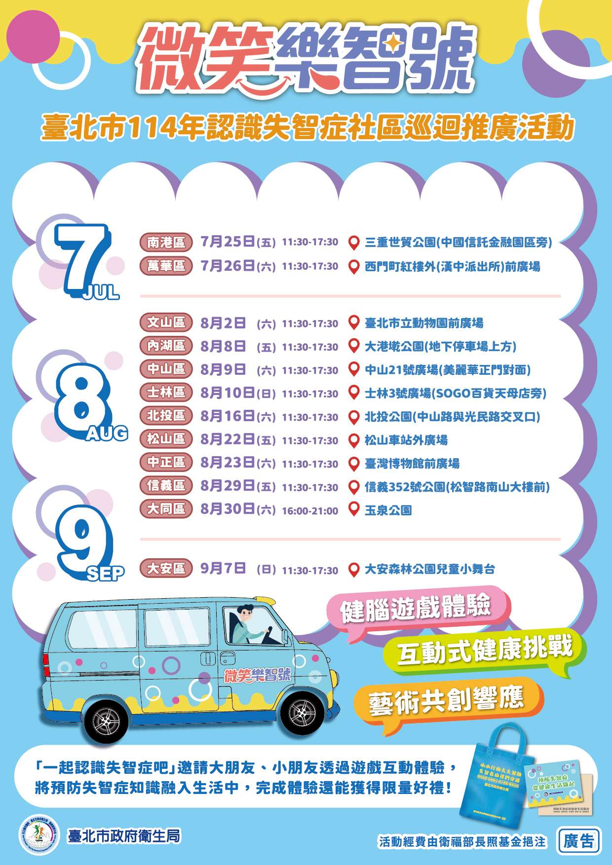 臺北市政府衛生局114年「微笑樂智號」7/25至9/7巡迴開跑!「健腦遊戲體驗」、「互動式健康挑戰」、「藝術共創響應」,一起參加將失智症知識融入生活!還有機會獲得超商及量販店禮券!