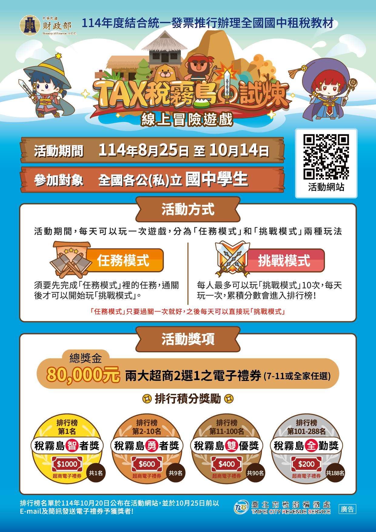 (三)內容:分為「任務模式」與「挑戰模式」兩種玩法,活動詳情請上活動網站(https://www.gotax.tw/tax2025/)或「北市稅處」粉絲專頁(https://www.facebook.com/tpctax/?locale=zh_TW)查詢。