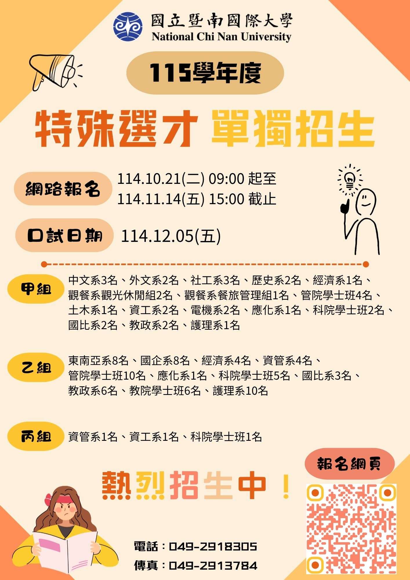 一、該校115學年度特殊選才單獨招生網路報名自114年10月21 日起至114年11月14日止。