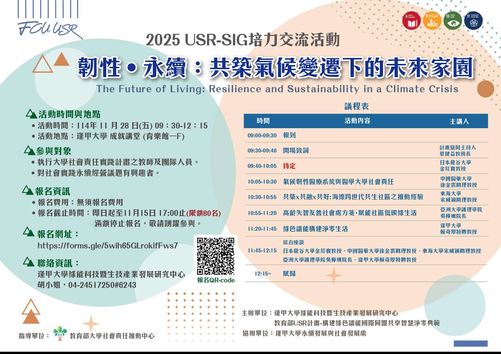四、活動謹訂於114年11月28日(五)上午9時30分,地點 於本校成就講堂(育樂館1F),並請於114年11月15日前完 成線上報名(報名網址:https://forms.gle /5wih65GLrokifFws7)。