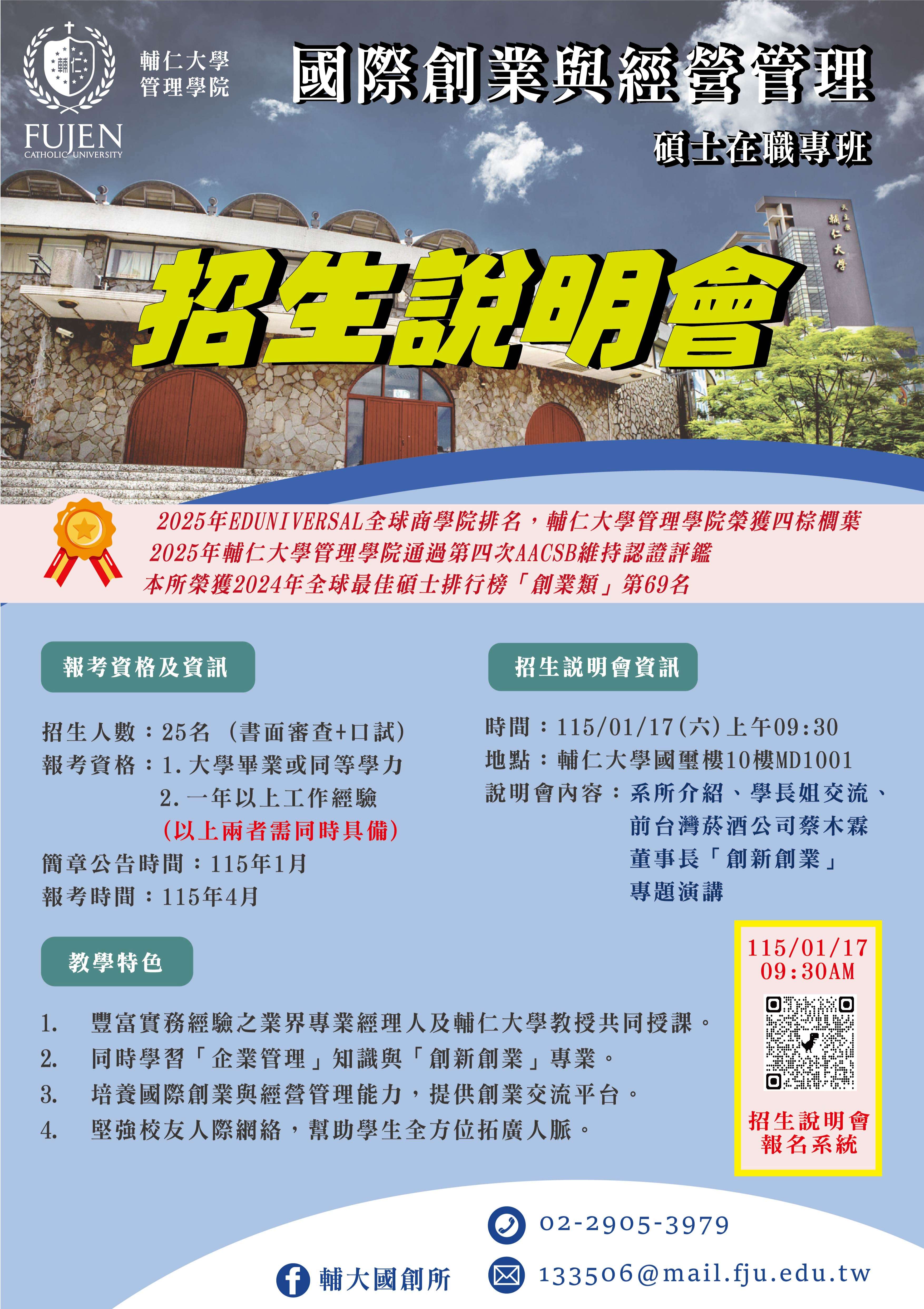 三、 本碩士在職專班115學年度招生說明會相關資訊如 下: