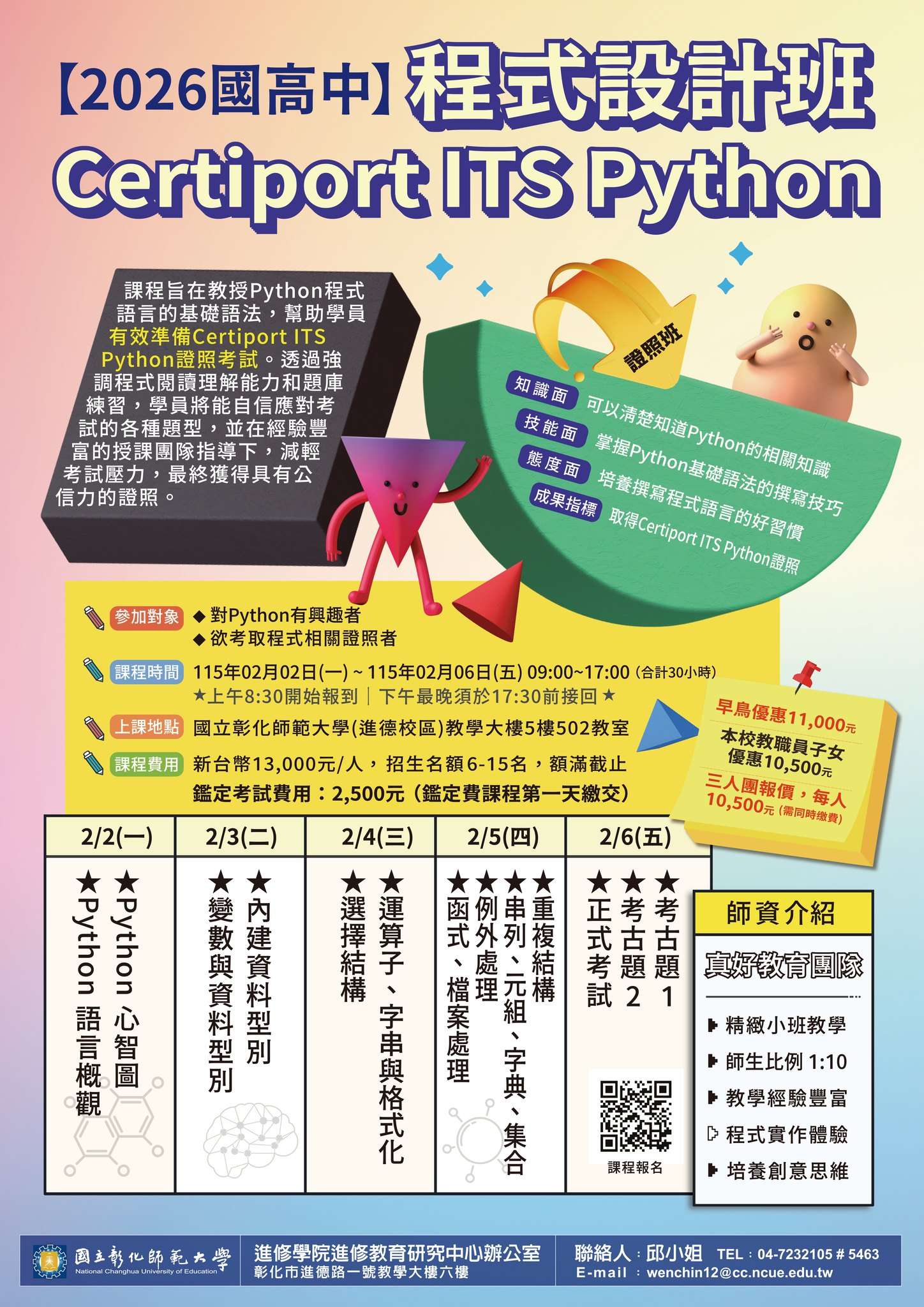 一、「【2026國高中程式語言】Certiport ITS Python程式設 計班」 (一)課程特色:Python是許多人學習文字型程式的第一選 擇,它很貼近自然語言(英文),沒有複雜的符號。本課 程將著重python程式語言的基礎語法,並協助考取 Certiport ITS Python 證照。 (二)課程時間:115年2月2日(一) 至2月6日(五) 9:00~17: 00,合計30小時。 (三)課程費用:13,000元/人。早鳥享優惠11,000元;三人團 報價,每人10,500元(需同時缴費)。
