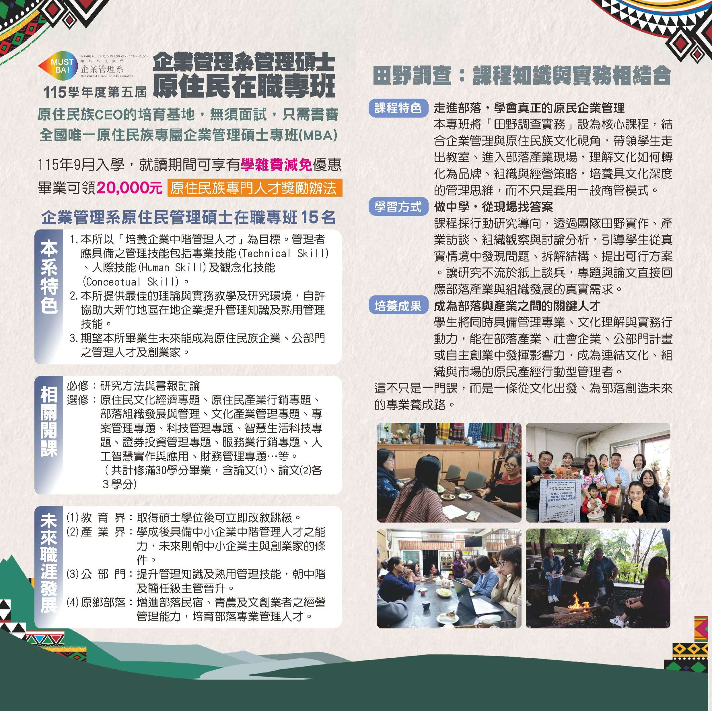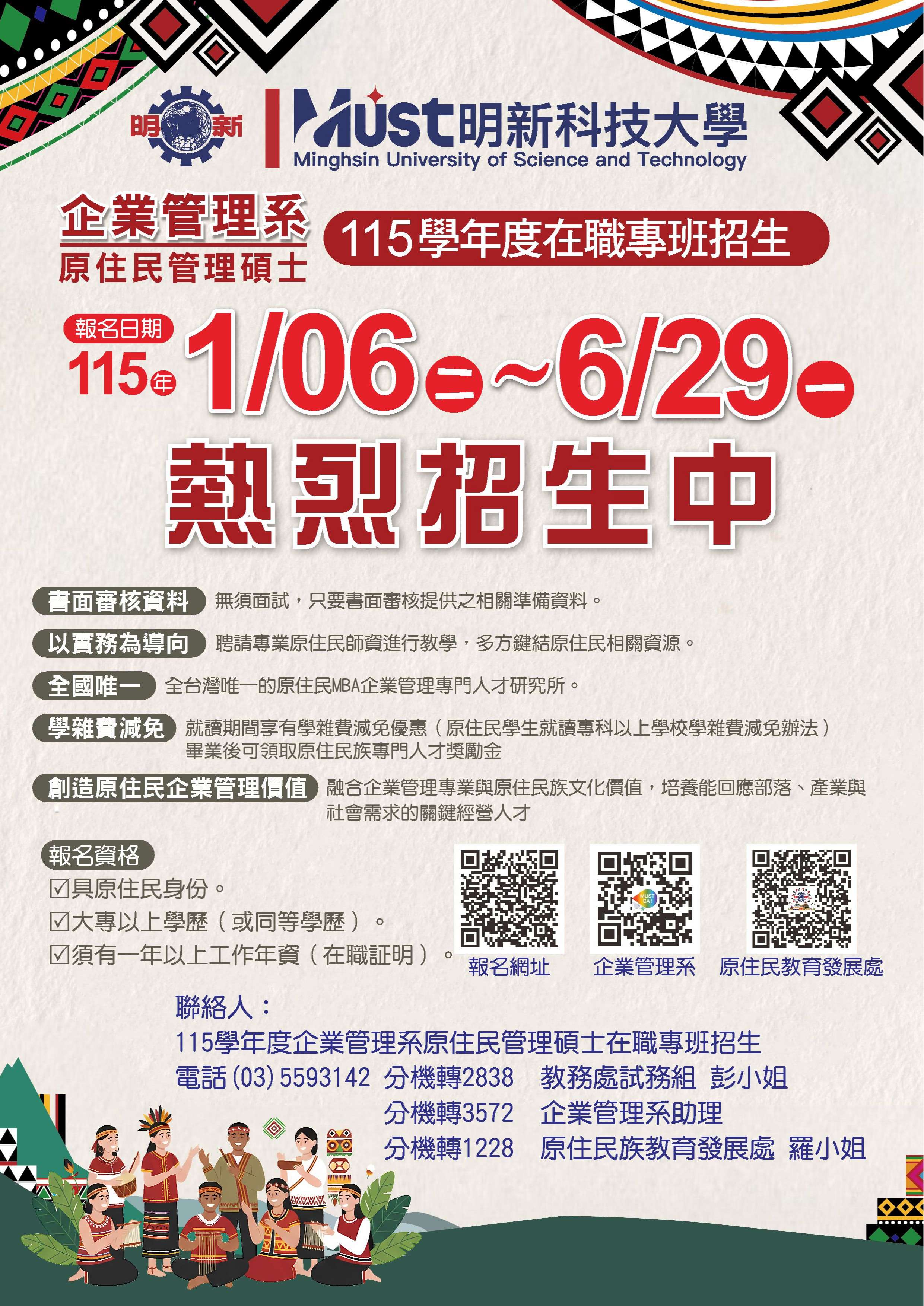 一、本校企業管理系管理碩士原住民在職專班招生網路報名起 迄時間:自即日起至115年6月29日下午4時止。